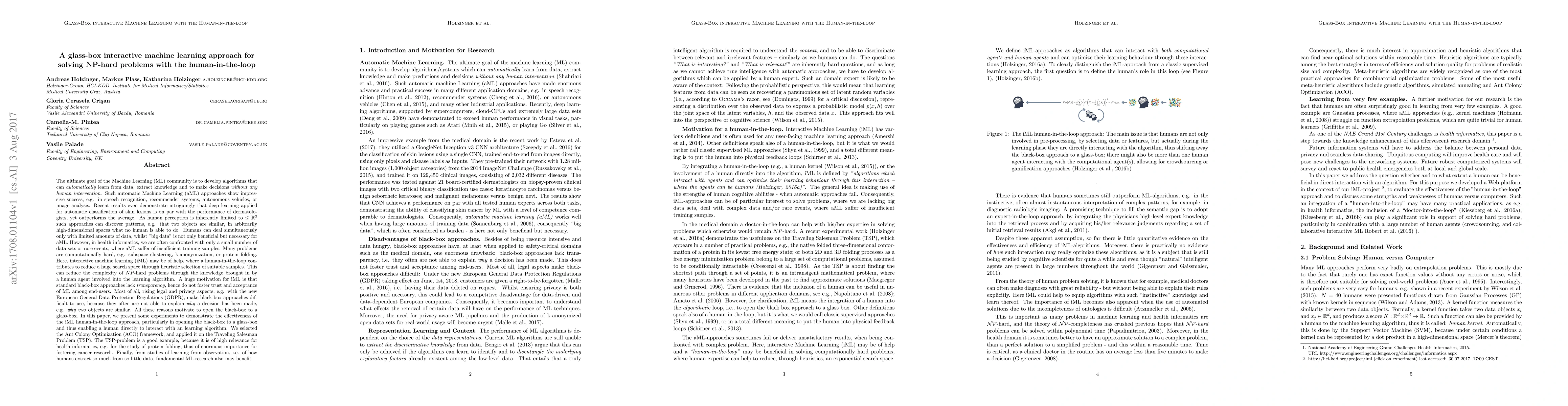 The goal of Machine Learning to automatically learn from data, extract knowledge and to make decisions without any human intervention. Such automatic (aML) approaches show impressive success. Recent results even demonstrate intriguingly that deep learning applied for automatic classification of skin lesions is on par with the performance of dermatologists, yet outperforms the average. As human perception is inherently limited, such approaches can discover patterns, e.g. that two objects are similar, in arbitrarily high-dimensional spaces what no human is able to do. Humans can deal only with limited amounts of data, whilst big data is beneficial for aML; however, in health informatics, we are often confronted with a small number of data sets, where aML suffer of insufficient training samples and many problems are computationally hard. Here, interactive machine learning (iML) may be of help, where a human-in-the-loop contributes to reduce the complexity of NP-hard problems. A further motivation for iML is that standard black-box approaches lack transparency, hence do not foster trust and acceptance of ML among end-users. Rising legal and privacy aspects, e.g. with the new European General Data Protection Regulations, make black-box approaches difficult to use, because they often are not able to explain why a decision has been made. In this paper, we present some experiments to demonstrate the effectiveness of the human-in-the-loop approach, particularly in opening the black-box to a glass-box and thus enabling a human directly to interact with an learning algorithm. We selected the Ant Colony Optimization framework, and applied it on the Traveling Salesman Problem, which is a good example, due to its relevance for health informatics, e.g. for the study of protein folding. From studies of how humans extract so much from so little data, fundamental ML-research also may benefit.