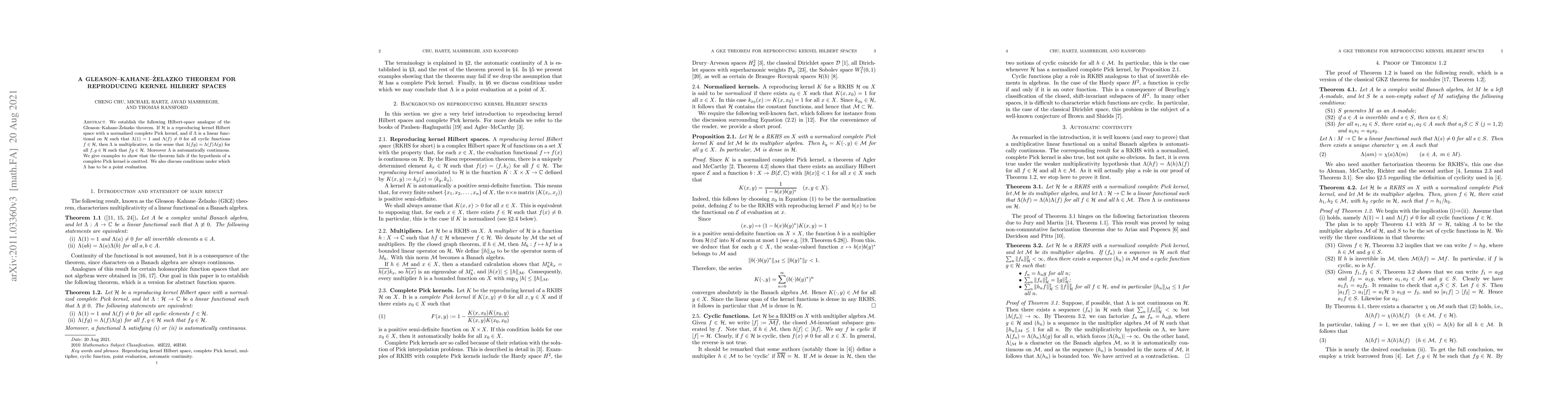 We establish the following Hilbert-space analogue of the Gleason-Kahane-\.Zelazko theorem. If $\mathcal{H}$ is a reproducing kernel Hilbert space with a normalized complete Pick kernel, and if $\Lambda$ is a linear functional on $\mathcal{H}$ such that $\Lambda(1)=1$ and $\Lambda(f)\ne0$ for all cyclic functions $f\in\mathcal{H}$, then $\Lambda$ is multiplicative, in the sense that $\Lambda(fg)=\Lambda(f)\Lambda(g)$ for all $f,g\in\mathcal{H}$ such that $fg\in\mathcal{H}$. Moreover $\Lambda$ is automatically continuous. We give examples to show that the theorem fails if the hypothesis of a complete Pick kernel is omitted. We also discuss conditions under which $\Lambda$ has to be a point evaluation.