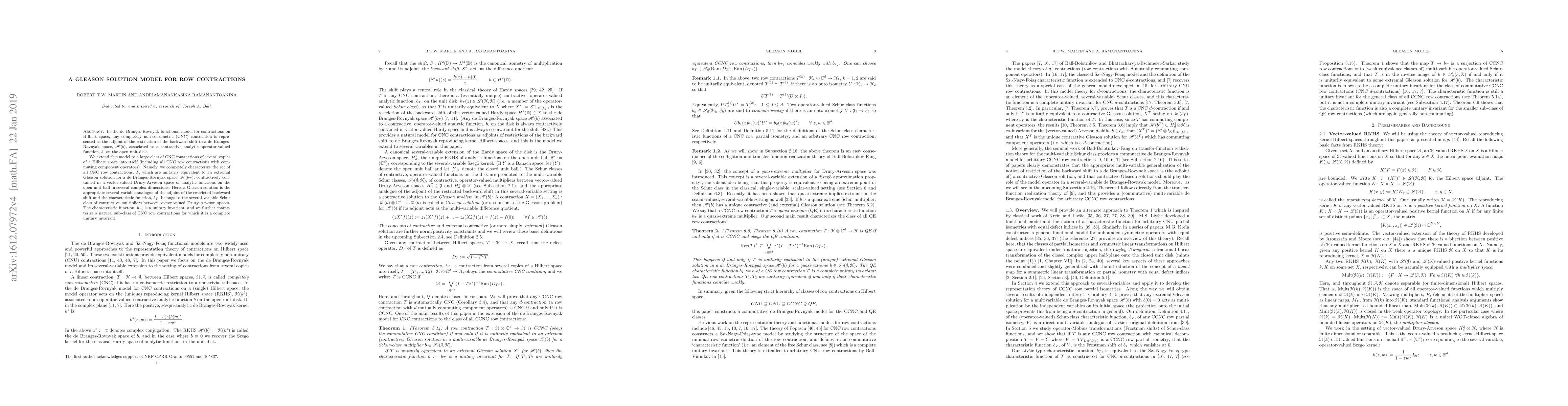 This paper extends the deBranges-Rovnyak functional model to characterize completely non-coisometric row contractions in several complex dimensions, showing they are unitarily equivalent to extremal Gleason solutions within vector-valued Drury-Arveson spaces. The characteristic function in the several-variable Schur class is identified as a complete unitary invariant for a specific subclass of such contractions.