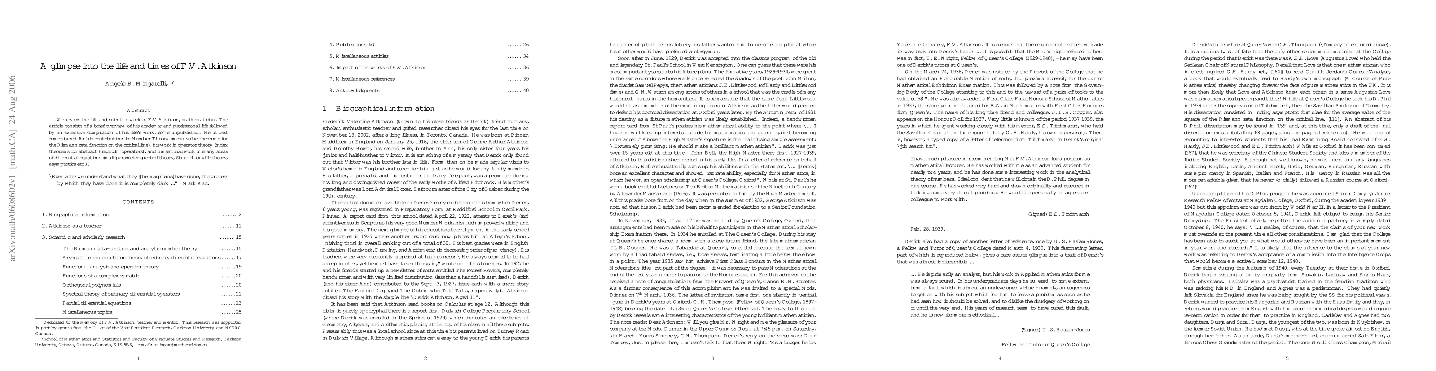 We review the life and scientific work of F.V Atkinson, mathematician. The article consists of a brief overview of his academic and professional life followed by an extensive compilation of his life's work, some unpublished. He is best remembered for his contributions to Number Theory (mean value theorems for the Riemann zeta function on the critical line), his work in operator theory (index theorems for abstract Fredholm operators), and his seminal work in many areas of differential equations (multiparameter spectral theory, Sturm-Liouville theory, asymptotics etc.)
