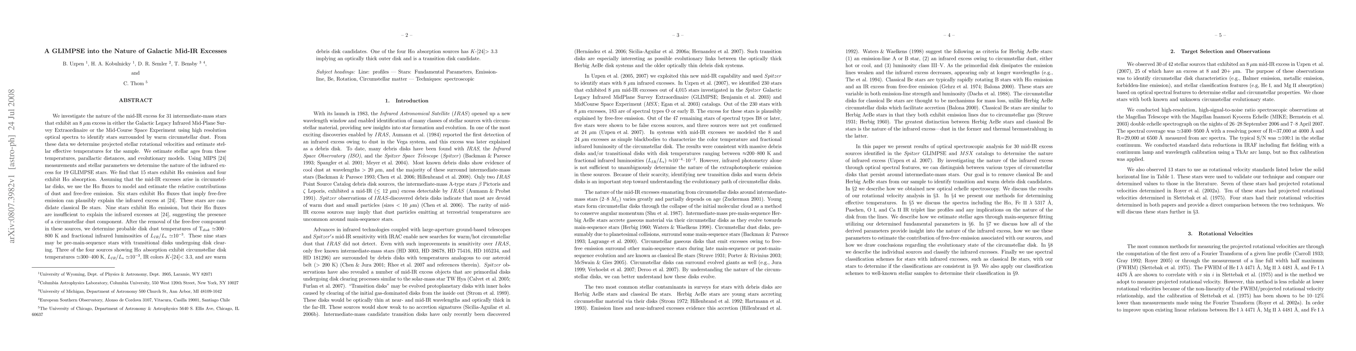 We investigate the nature of the mid-IR excess for 31 intermediate-mass stars that exhibit an 8 micron excess in either the Galactic Legacy Infrared Mid-Plane Survey Extraordinaire or the Mid-Course Space Experiment using high resolution optical spectra to identify stars surrounded by warm circumstellar dust. From these data we determine projected stellar rotational velocities and estimate stellar effective temperatures for the sample. We estimate stellar ages from these temperatures, parallactic distances, and evolutionary models. Using MIPS [24] measurements and stellar parameters we determine the nature of the infrared excess for 19 GLIMPSE stars. We find that 15 stars exhibit Halpha emission and four exhibit Halpha absorption. Assuming that the mid-IR excesses arise in circumstellar disks, we use the Halpha fluxes to model and estimate the relative contributions of dust and free-free emission. Six stars exhibit Halpha fluxes that imply free-free emission can plausibly explain the infrared excess at [24]. These stars are candidate classical Be stars. Nine stars exhibit Halpha emission, but their Halpha fluxes are insufficient to explain the infrared excesses at [24], suggesting the presence of a circumstellar dust component. After the removal of the free-free component in these sources, we determine probable disk dust temperatures of Tdisk~300-800 K and fractional infrared luminosities of L(IR)/L(*)~10^-3. These nine stars may be pre-main-sequence stars with transitional disks undergoing disk clearing. Three of the four sources showing Halpha absorption exhibit circumstellar disk temperatures ~300-400 K, L(IR)/L(*)~10^-3, IR colors K-[24]< 3.3, and are warm debris disk candidates. One of the four Halpha absorption sources has K-[24]> 3.3 implying an optically thick outer disk and is a transition disk candidate.