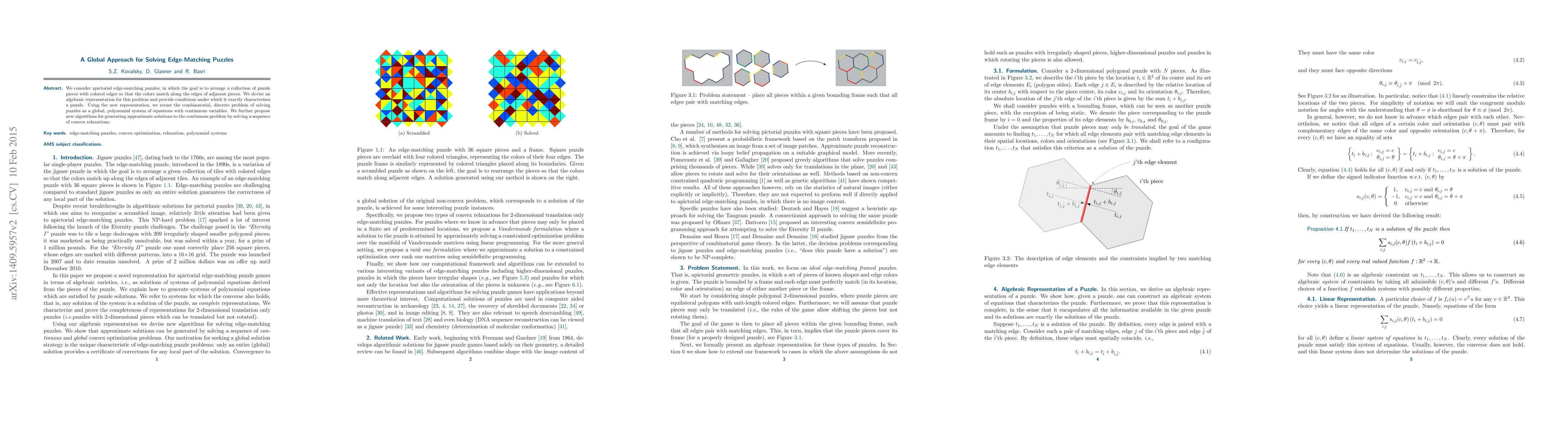 We consider apictorial edge-matching puzzles, in which the goal is to arrange a collection of puzzle pieces with colored edges so that the colors match along the edges of adjacent pieces. We devise an algebraic representation for this problem and provide conditions under which it exactly characterizes a puzzle. Using the new representation, we recast the combinatorial, discrete problem of solving puzzles as a global, polynomial system of equations with continuous variables. We further propose new algorithms for generating approximate solutions to the continuous problem by solving a sequence of convex relaxations.