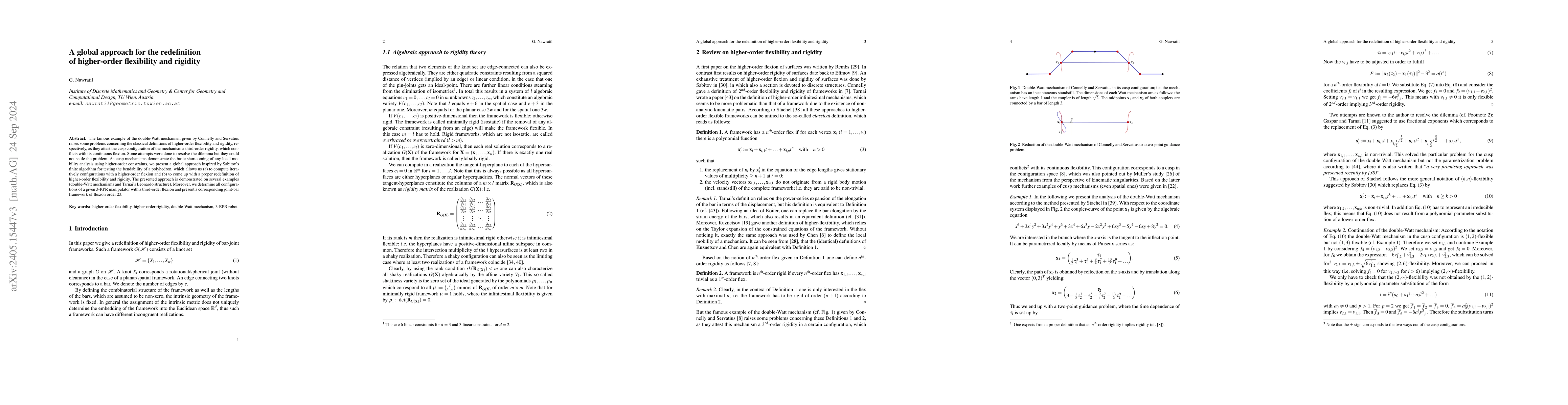 The famous example of the double-Watt mechanism given by Connelly and Servatius raises some problems concerning the classical definitions of higher-order flexibility and rigidity, respectively, as they attest the cusp configuration of the mechanism a third-order rigidity, which conflicts with its continuous flexion. Some attempts were done to resolve the dilemma but they could not settle the problem. As cusp mechanisms demonstrate the basic shortcoming of any local mobility analysis using higher-order constraints, we present a global approach inspired by Sabitov's finite algorithm for testing the bendability of a polyhedron, which allows us (a) to compute iteratively configurations with a higher-order flexion and (b) to come up with a proper redefinition of higher-order flexibility and rigidity. We also give algorithms for computing the flexion orders as well as the associated flexes. The presented approach is demonstrated on several examples (double-Watt mechanisms and Tarnai's Leonardo structure). Moreover, we determine all configurations of a given 3-RPR manipulator with a third-order flexion and present a corresponding joint-bar framework of flexion order 23.
