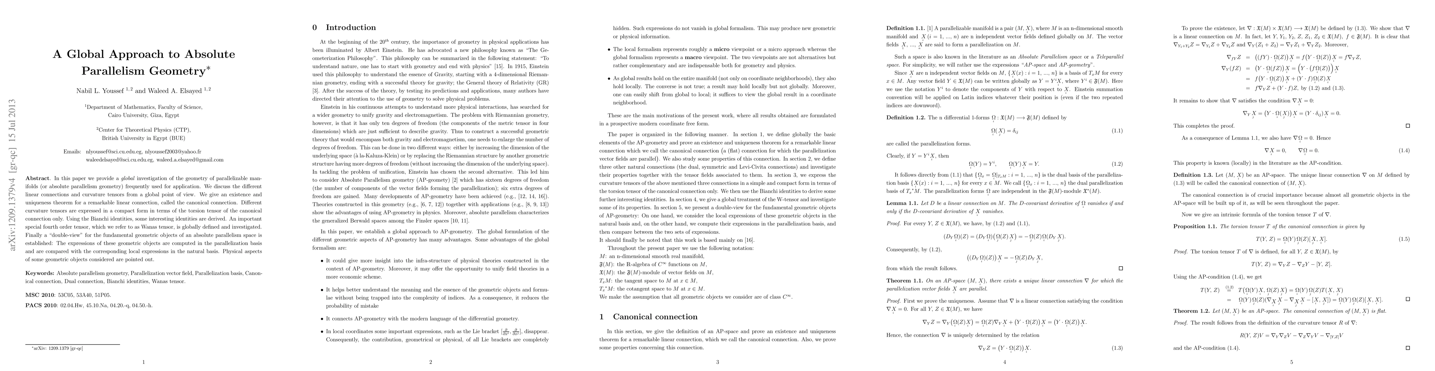 This paper explores the global geometry of parallelizable manifolds, focusing on linear connections, curvature tensors, and the canonical connection. It introduces the Wanas tensor and establishes a double-view of geometric objects in both parallelization and natural bases, highlighting physical implications.