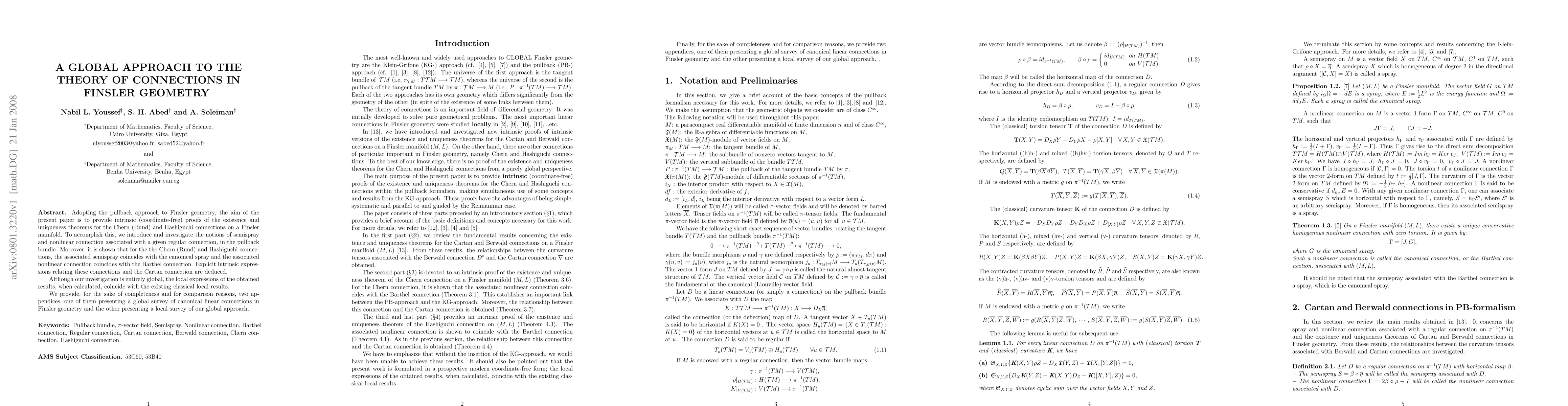 This paper provides intrinsic proofs for the existence and uniqueness of Chern (Rund) and Hashiguchi connections in Finsler geometry using a global pullback approach. It introduces semispray and nonlinear connections, showing their equivalence to canonical spray and Barthel connection, respectively.