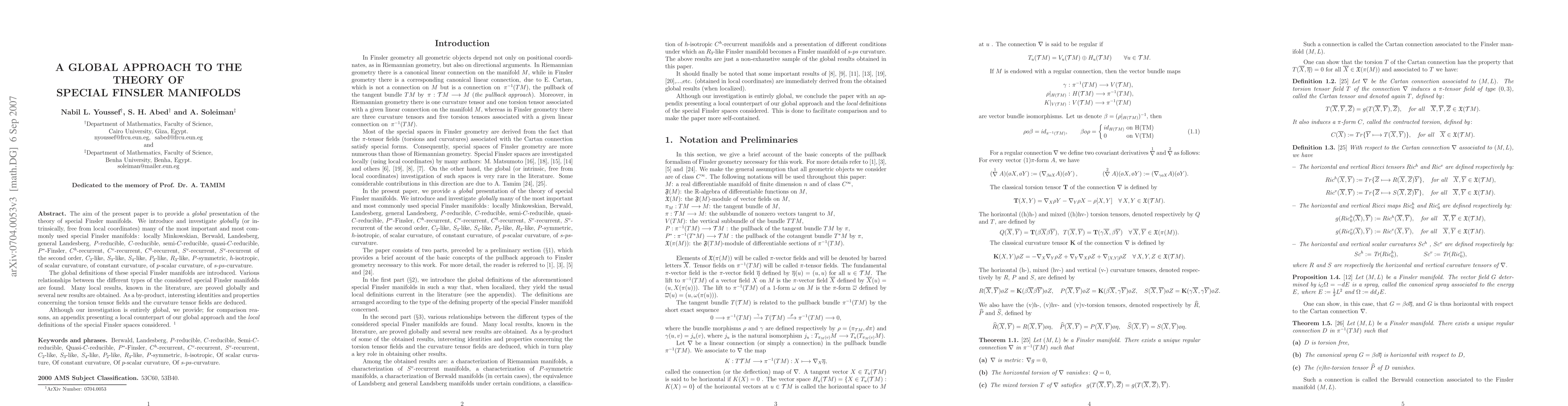 This paper presents a global framework for the theory of special Finsler manifolds, introducing and analyzing various types such as Minkowskian, Berwald, and recurrent forms, and establishing their global definitions and relationships. It also deduces new global results and properties of torsion and curvature tensor fields.
