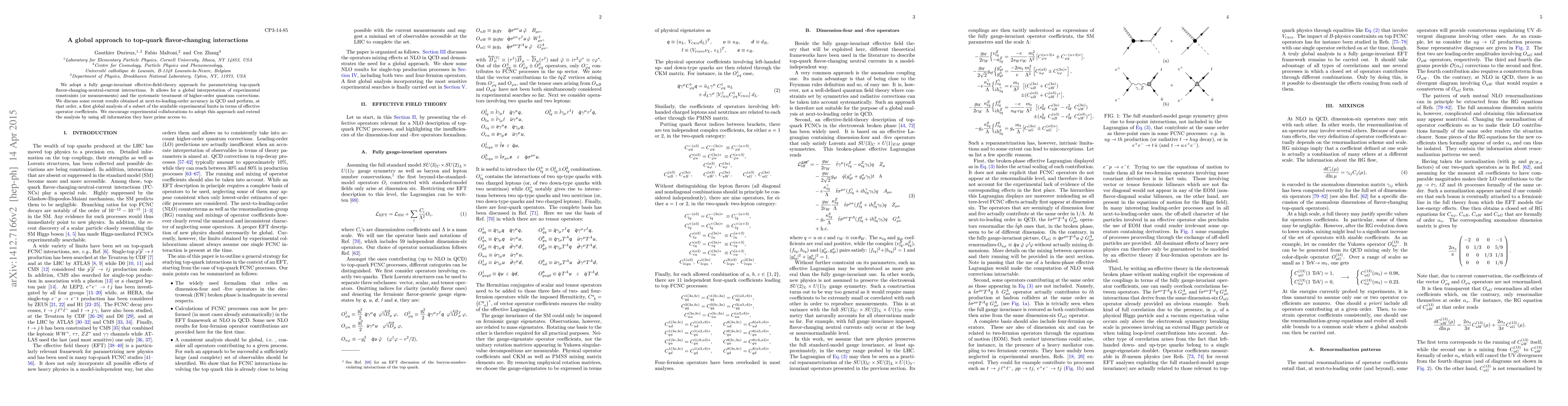 We adopt a fully gauge-invariant effective-field-theory approach for parametrizing top-quark flavor-changing-neutral-current interactions. It allows for a global interpretation of experimental constraints (or measurements) and the systematic treatment of higher-order quantum corrections. We discuss some recent results obtained at next-to-leading-order accuracy in QCD and perform, at that order, a first global analysis of a subset of the available experimental limits in terms of effective operator coefficients. We encourage experimental collaborations to adopt this approach and extend the analysis by using all information they have prime access to.