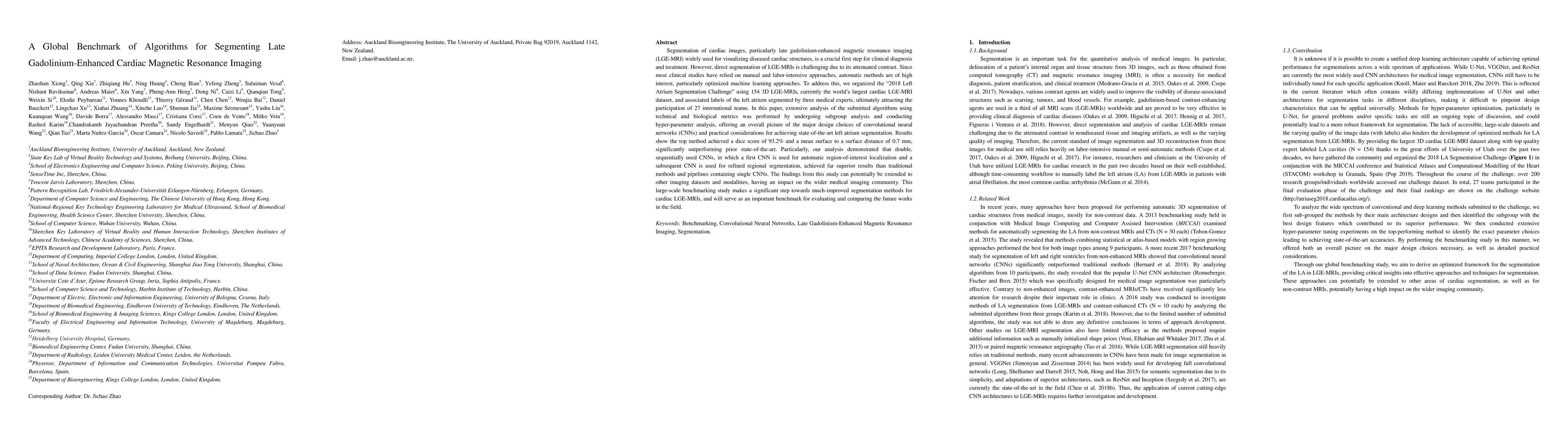 This paper presents a comprehensive benchmark for algorithms aimed at segmenting late gadolinium-enhanced cardiac magnetic resonance imaging (LGE-MRI), highlighting the challenges and advancements in automated segmentation techniques. The study organized a large-scale challenge, attracting 27 international teams, and demonstrated that a double convolutional neural network (CNN) approach significantly outperformed traditional methods, achieving superior segmentation accuracy.