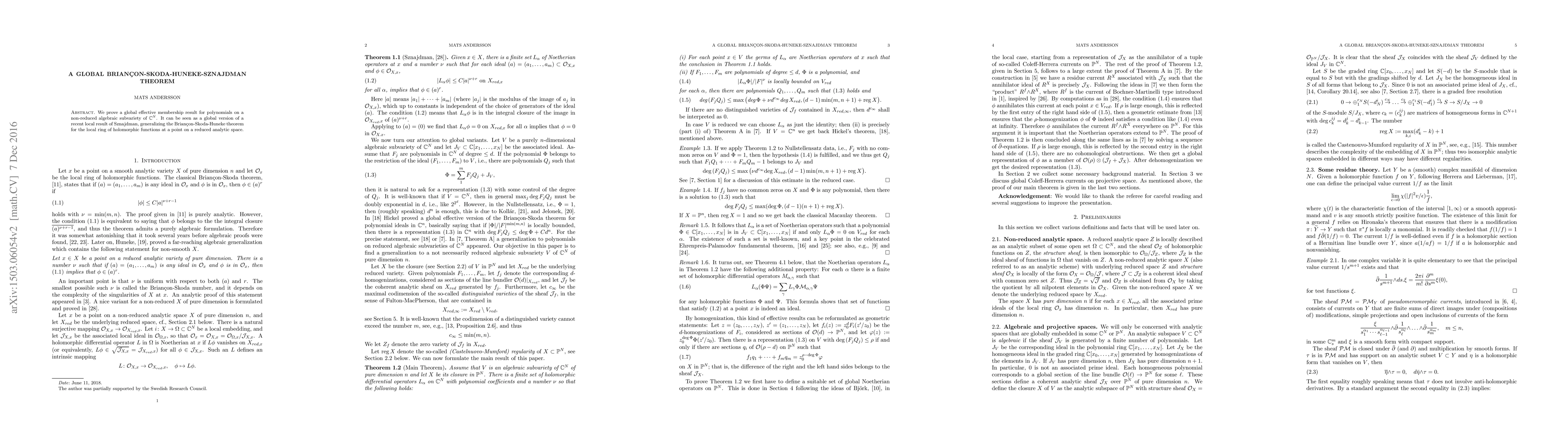 Summary: This paper establishes a global effective membership theorem for polynomials on non-reduced algebraic subvarieties of $\mathbb{C}^N$, extending the Briançon-Skoda-Huneke theorem from local holomorphic functions to a global context.