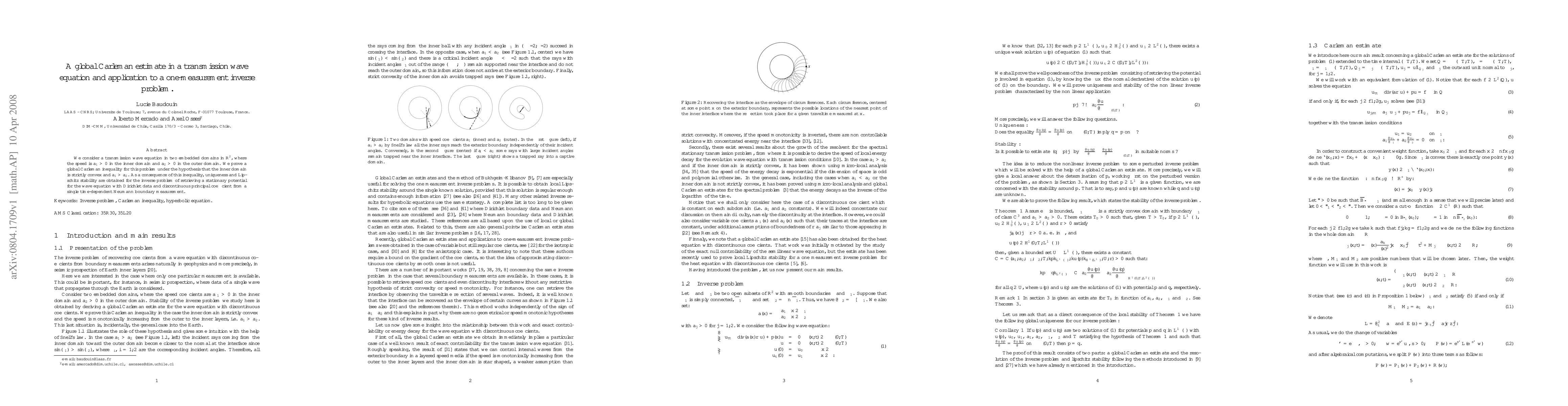 We consider a transmission wave equation in two embedded domains in $R^2$, where the speed is $a1 > 0$ in the inner domain and $a2 > 0$ in the outer domain. We prove a global Carleman inequality for this problem under the hypothesis that the inner domain is strictly convex and $a1 > a2$ . As a consequence of this inequality, uniqueness and Lip- schitz stability are obtained for the inverse problem of retrieving a stationary potential for the wave equation with Dirichlet data and discontinuous principal coefficient from a single time-dependent Neumann boundary measurement.
