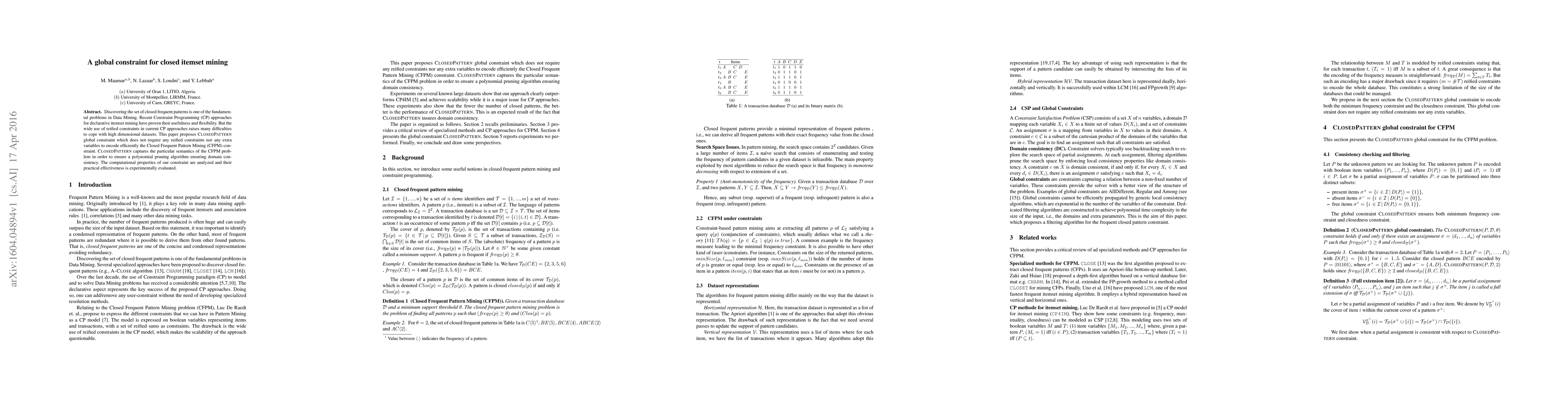Discovering the set of closed frequent patterns is one of the fundamental problems in Data Mining. Recent Constraint Programming (CP) approaches for declarative itemset mining have proven their usefulness and flexibility. But the wide use of reified constraints in current CP approaches raises many difficulties to cope with high dimensional datasets. This paper proposes CLOSED PATTERN global constraint which does not require any reified constraints nor any extra variables to encode efficiently the Closed Frequent Pattern Mining (CFPM) constraint. CLOSED-PATTERN captures the particular semantics of the CFPM problem in order to ensure a polynomial pruning algorithm ensuring domain consistency. The computational properties of our constraint are analyzed and their practical effectiveness is experimentally evaluated.