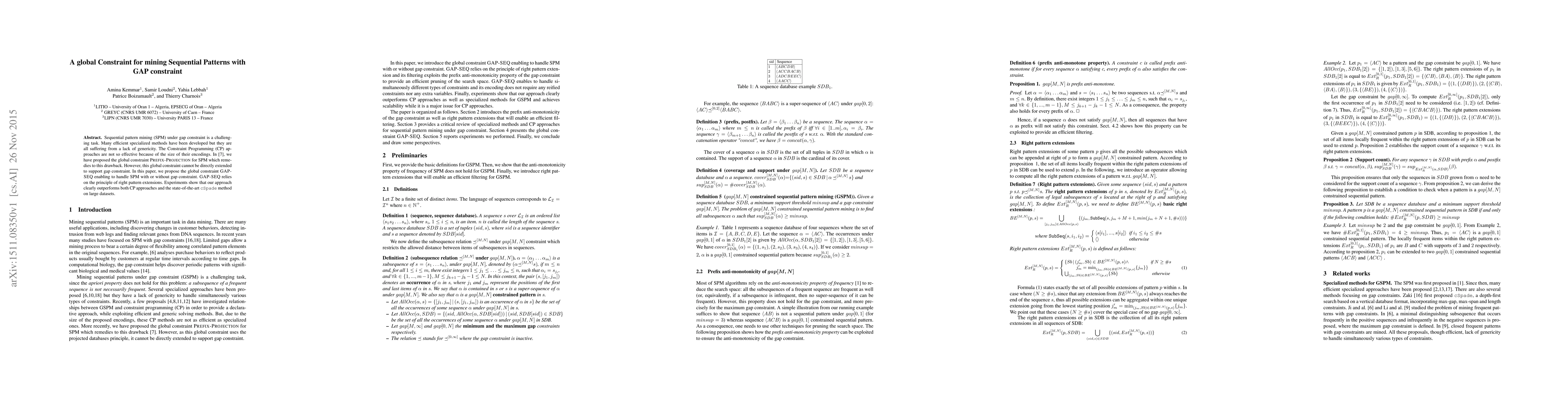 This paper proposes the global constraint GAP-SEQ for efficient sequential pattern mining (SPM) with or without gap constraints. The new approach outperforms existing constraint programming methods and the cSpade algorithm on large datasets.