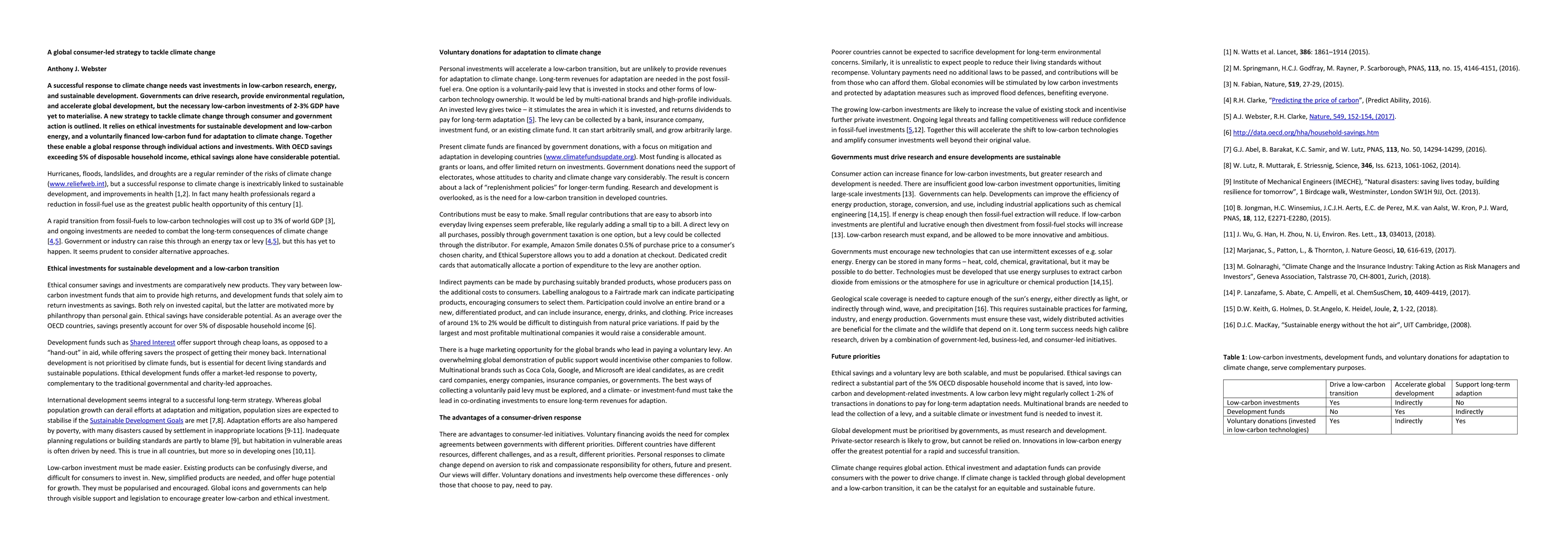 The paper introduces a consumer-led strategy combining ethical investments and voluntary financing for climate change adaptation and low-carbon transition.