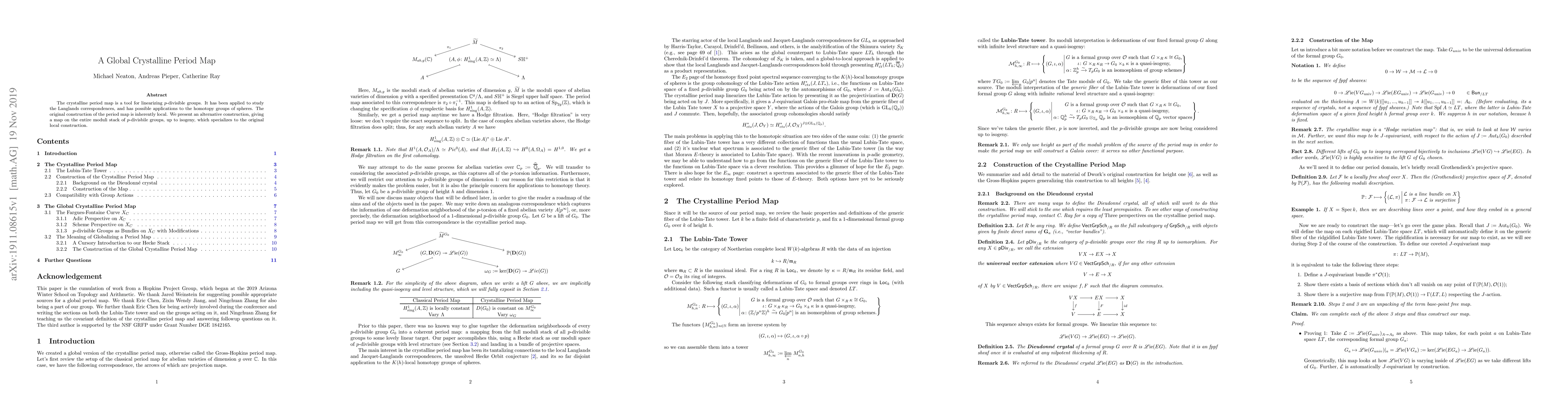 The crystalline period map is a tool for linearizing $p$-divisible groups. It has been applied to study the Langlands correspondences, and has possible applications to the homotopy groups of spheres. The original construction of the period map is inherently local. We present an alternative construction, giving a map on the entire moduli stack of $p$-divisbile groups, up to isogeny, which specializes to the original local construction.