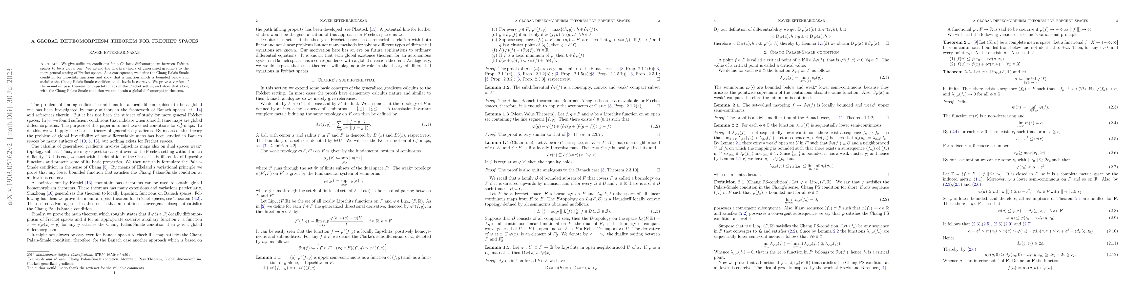 This paper establishes sufficient conditions for a $C^1_c$-local diffeomorphism between Fréchet spaces to extend globally, extending Clarke's theory of generalized gradients to Fréchet spaces. It introduces the Chang Palais-Smale condition for Lipschitz functions, proves a mountain pass theorem for Lipschitz maps in this setting, and demonstrates that these conditions lead to a global diffeomorphism theorem.