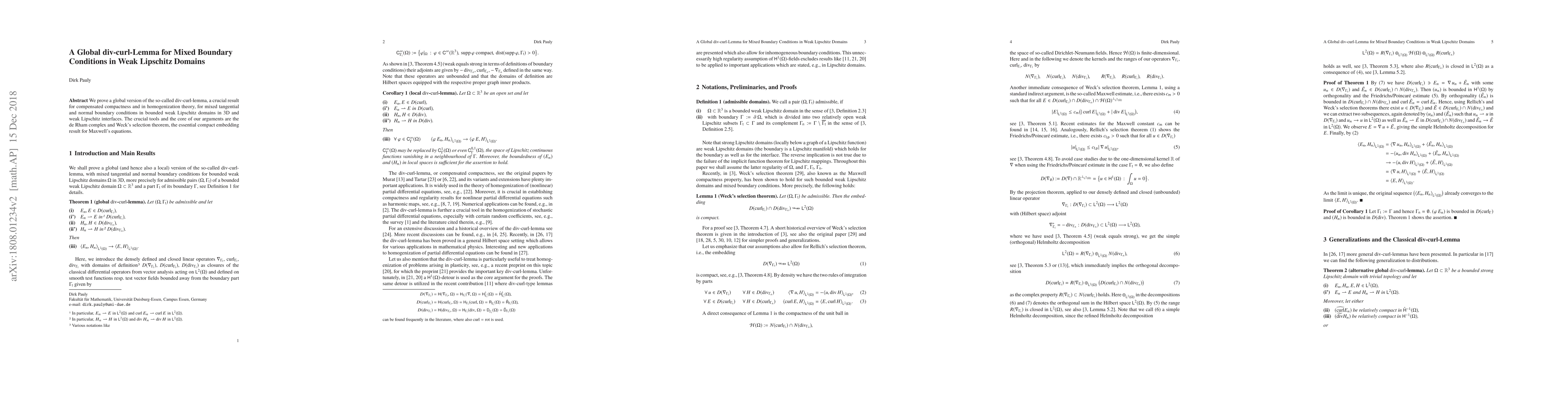 Summary: This paper establishes a global div-curl-lemma for mixed boundary conditions in weak Lipschitz domains, utilizing the de Rham complex and Weck's selection theorem to ensure essential compact embedding for Maxwell's equations.