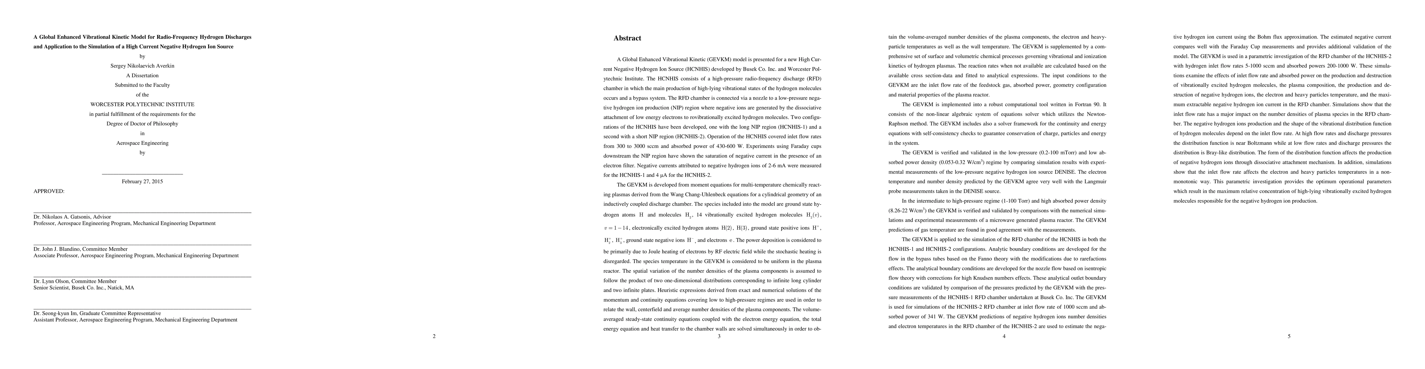 This paper presents a Global Enhanced Vibrational Kinetic Model (GEVKM) for simulating high current negative hydrogen ion sources, focusing on a high-pressure radio-frequency discharge chamber. The GEVKM model is validated across various plasma reactors and applied to analyze the performance of a Busek Co. Inc. and Worcester Polytechnic Institute developed ion source under different operational conditions.