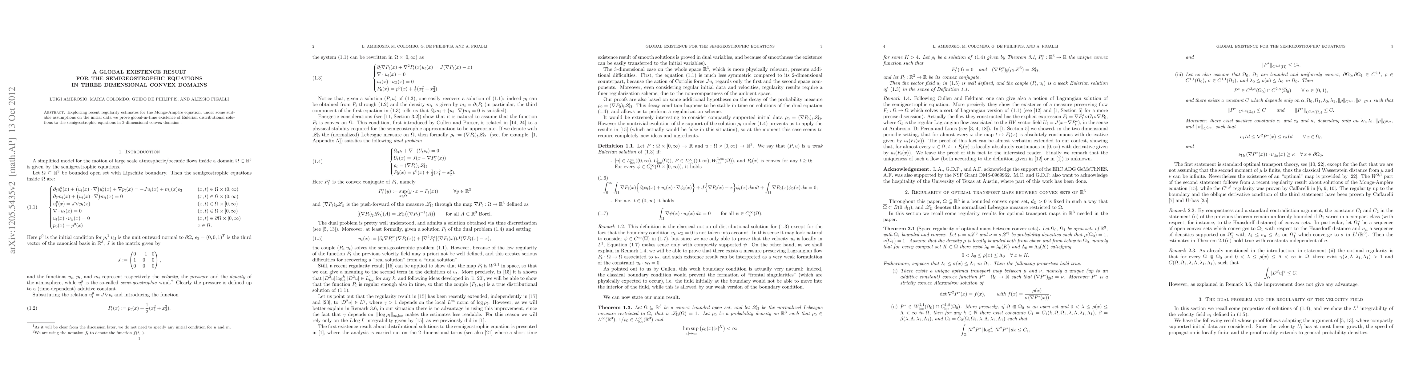 Exploiting recent regularity estimates for the Monge-Amp\`ere equation, under some suitable assumptions on the initial data we prove global-in-time existence of Eulerian distributional solutions to the semigeostrophic equations in 3-dimensional convex domains.