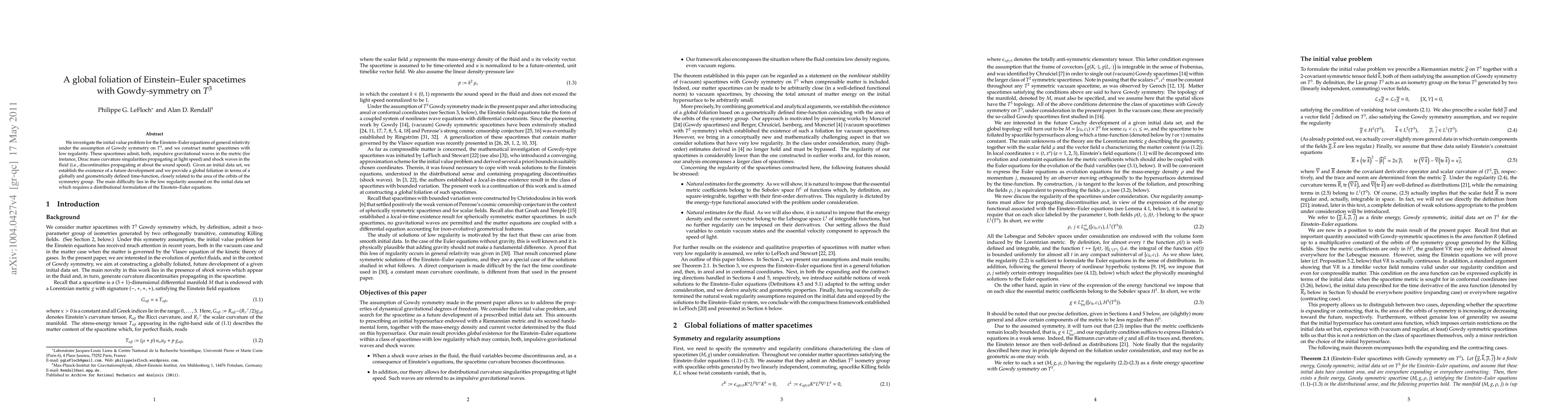 This paper investigates Einstein-Euler spacetimes with Gowdy symmetry on T3, showing that low-regularity initial data admit impulsive gravitational waves and shock waves, and establishes a global foliation of spacetimes.