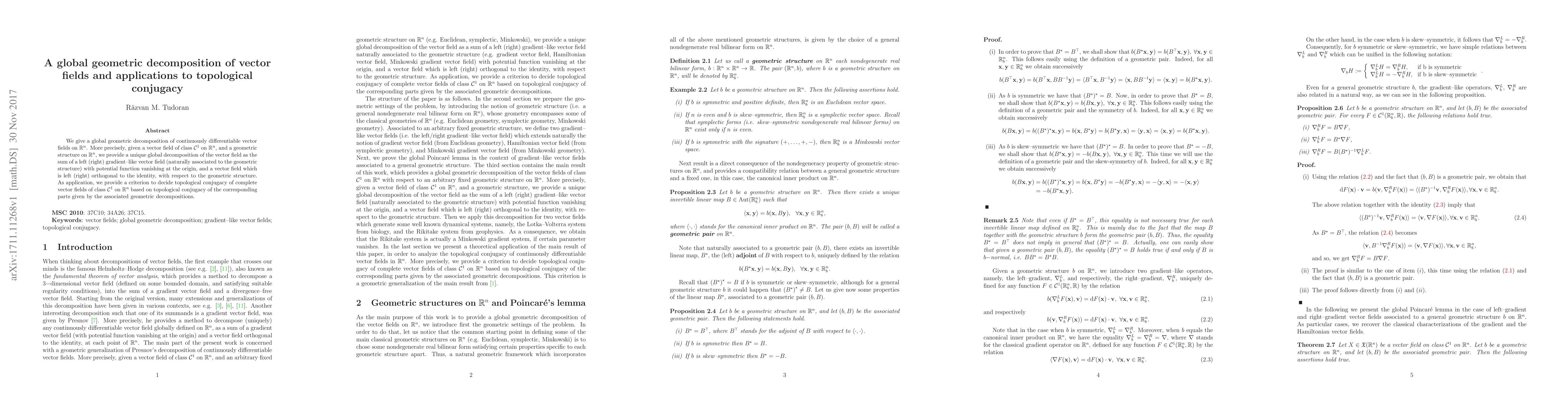 We give a global geometric decomposition of continuously differentiable vector fields on $\mathbb{R}^n$. More precisely, given a vector field of class $\mathcal{C}^{1}$ on $\mathbb{R}^{n}$, and a geometric structure on $\mathbb{R}^n$, we provide a unique global decomposition of the vector field as the sum of a left (right) gradient--like vector field (naturally associated to the geometric structure) with potential function vanishing at the origin, and a vector field which is left (right) orthogonal to the identity, with respect to the geometric structure. As application, we provide a criterion to decide topological conjugacy of complete vector fields of class $\mathcal{C}^1$ on $\mathbb{R}^{n}$ based on topological conjugacy of the corresponding parts given by the associated geometric decompositions.
