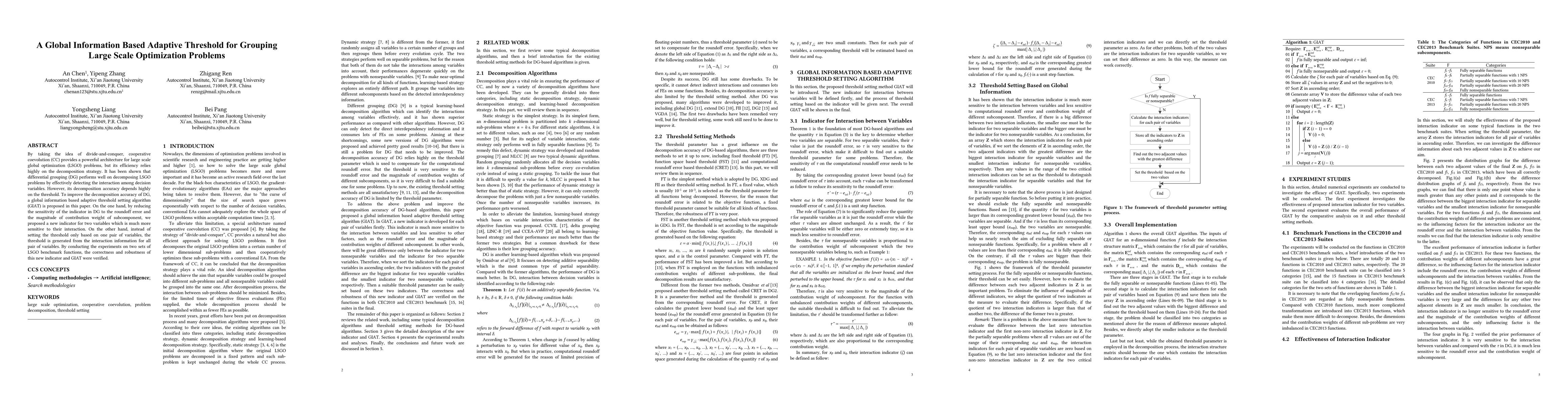 By taking the idea of divide-and-conquer, cooperative coevolution (CC) provides a powerful architecture for large scale global optimization (LSGO) problems, but its efficiency relies highly on the decomposition strategy. It has been shown that differential grouping (DG) performs well on decomposing LSGO problems by effectively detecting the interaction among decision variables. However, its decomposition accuracy depends highly on the threshold. To improve the decomposition accuracy of DG, a global information based adaptive threshold setting algorithm (GIAT) is proposed in this paper. On the one hand, by reducing the sensitivity of the indicator in DG to the roundoff error and the magnitude of contribution weight of subcomponent, we proposed a new indicator for two variables which is much more sensitive to their interaction. On the other hand, instead of setting the threshold only based on one pair of variables, the threshold is generated from the interaction information for all pair of variables. By conducting the experiments on two sets of LSGO benchmark functions, the correctness and robustness of this new indicator and GIAT were verified.