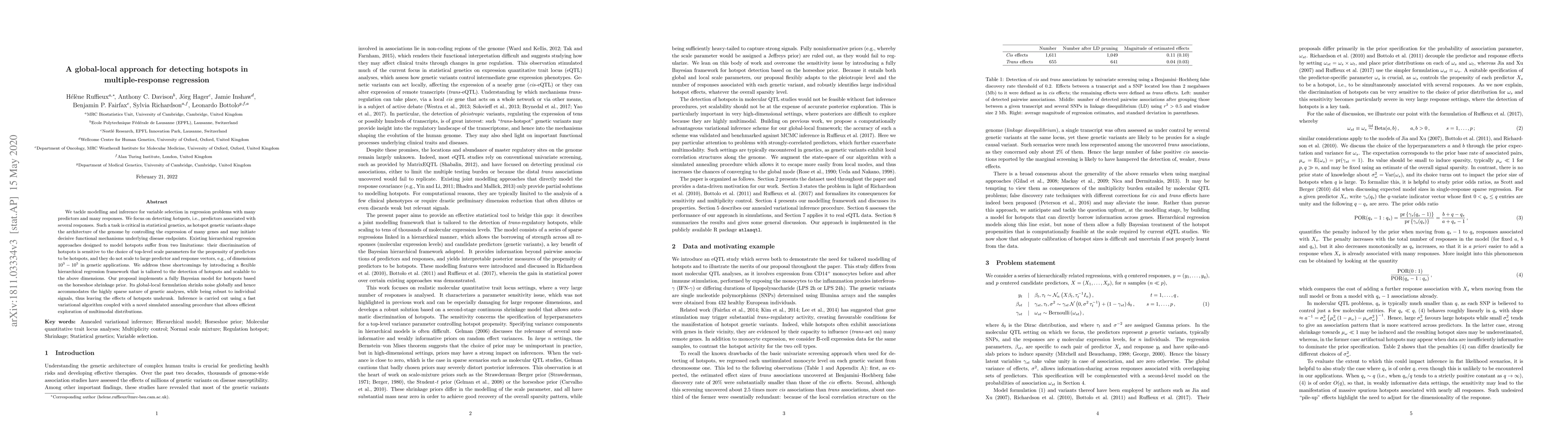 We tackle modelling and inference for variable selection in regression problems with many predictors and many responses. We focus on detecting hotspots, i.e., predictors associated with several responses. Such a task is critical in statistical genetics, as hotspot genetic variants shape the architecture of the genome by controlling the expression of many genes and may initiate decisive functional mechanisms underlying disease endpoints. Existing hierarchical regression approaches designed to model hotspots suffer from two limitations: their discrimination of hotspots is sensitive to the choice of top-level scale parameters for the propensity of predictors to be hotspots, and they do not scale to large predictor and response vectors, e.g., of dimensions $10^3-10^5$ in genetic applications. We address these shortcomings by introducing a flexible hierarchical regression framework that is tailored to the detection of hotspots and scalable to the above dimensions. Our proposal implements a fully Bayesian model for hotspots based on the horseshoe shrinkage prior. Its global-local formulation shrinks noise globally and hence accommodates the highly sparse nature of genetic analyses, while being robust to individual signals, thus leaving the effects of hotspots unshrunk. Inference is carried out using a fast variational algorithm coupled with a novel simulated annealing procedure that allows efficient exploration of multimodal distributions.