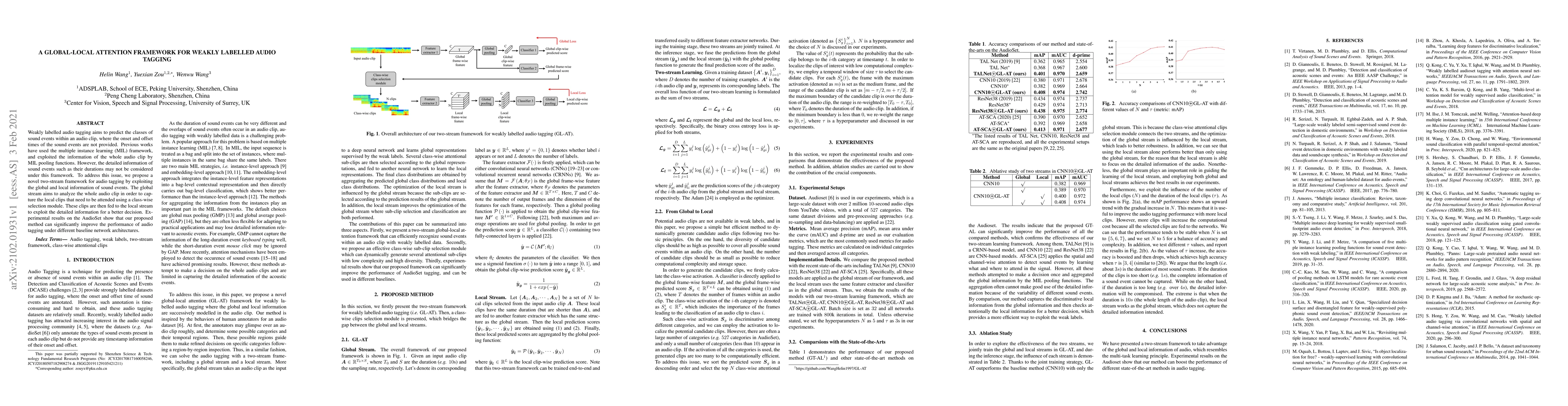 This paper proposes a global-local attention framework for weakly labelled audio tagging, utilizing both global and local information to enhance sound event classification. The global stream captures overall audio context, and the local stream focuses on detailed event information, significantly improving tagging performance on the AudioSet dataset.