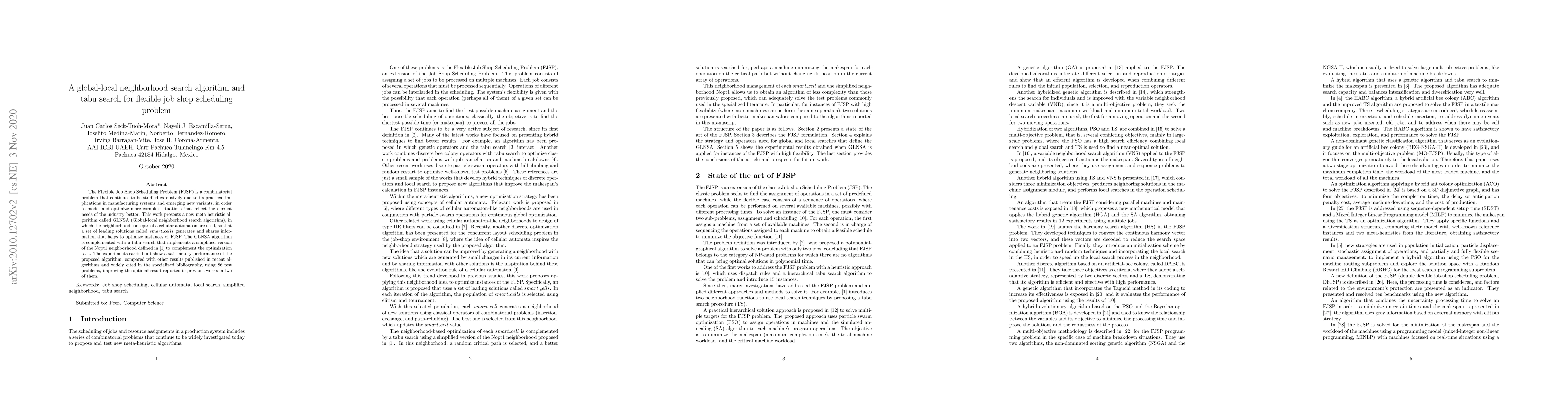 The Flexible Job Shop Scheduling Problem (FJSP) is a combinatorial problem that continues to be studied extensively due to its practical implications in manufacturing systems and emerging new variants, in order to model and optimize more complex situations that reflect the current needs of the industry better. This work presents a new meta-heuristic algorithm called GLNSA (Global-local neighborhood search algorithm), in which the neighborhood concepts of a cellular automaton are used, so that a set of leading solutions called "smart_cells" generates and shares information that helps to optimize instances of FJSP. The GLNSA algorithm is complemented with a tabu search that implements a simplified version of the Nopt1 neighborhood defined in [1] to complement the optimization task. The experiments carried out show a satisfactory performance of the proposed algorithm, compared with other results published in recent algorithms and widely cited in the specialized bibliography, using 86 test problems, improving the optimal result reported in previous works in two of them.
