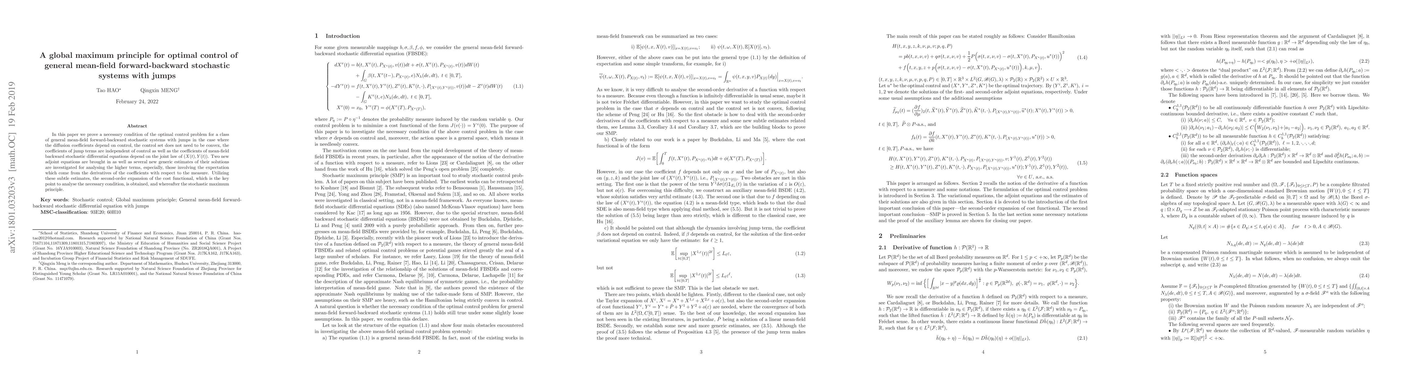 In this paper we prove a necessary condition of the optimal control problem for a class of general mean-field forward-backward stochastic systems with jumps in the case where the diffusion coefficients depend on control, the control set does not need to be convex, the coefficients of jump terms are independent of control as well as the coefficients of mean-field backward stochastic differential equations depend on the joint law of $(X(t),Y(t))$. Two new adjoint equations are brought in as well as several new generic estimates of their solutions are investigated for analysing the higher terms, especially, those involving the expectation which come from the derivatives of the coefficients with respect to the measure. Utilizing these subtle estimates, the second-order expansion of the cost functional, which is the key point to analyse the necessary condition, is obtained, and whereafter the stochastic maximum principle.