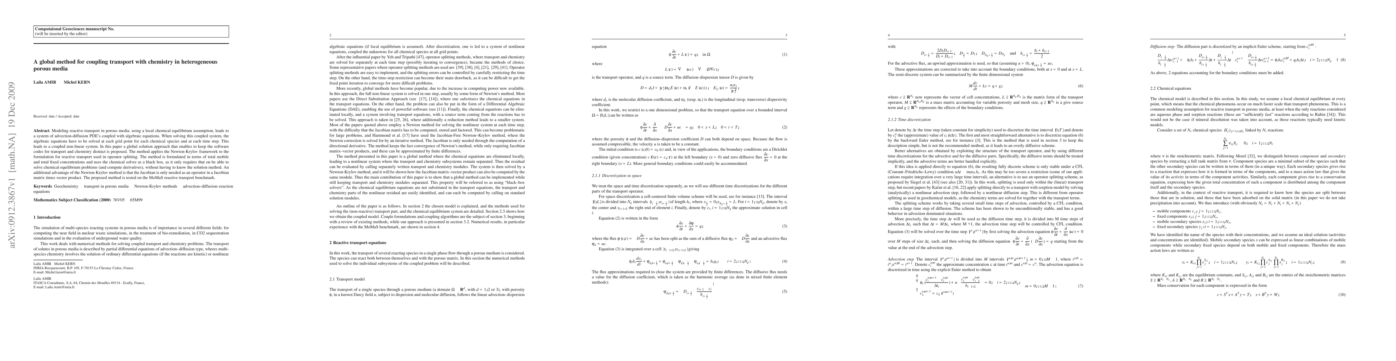 This paper proposes a global method for coupling transport with chemistry in heterogeneous porous media, using a Newton-Krylov framework within operator splitting. The method maintains distinct software codes for transport and chemistry, requiring only the ability to solve chemical equilibrium problems.
