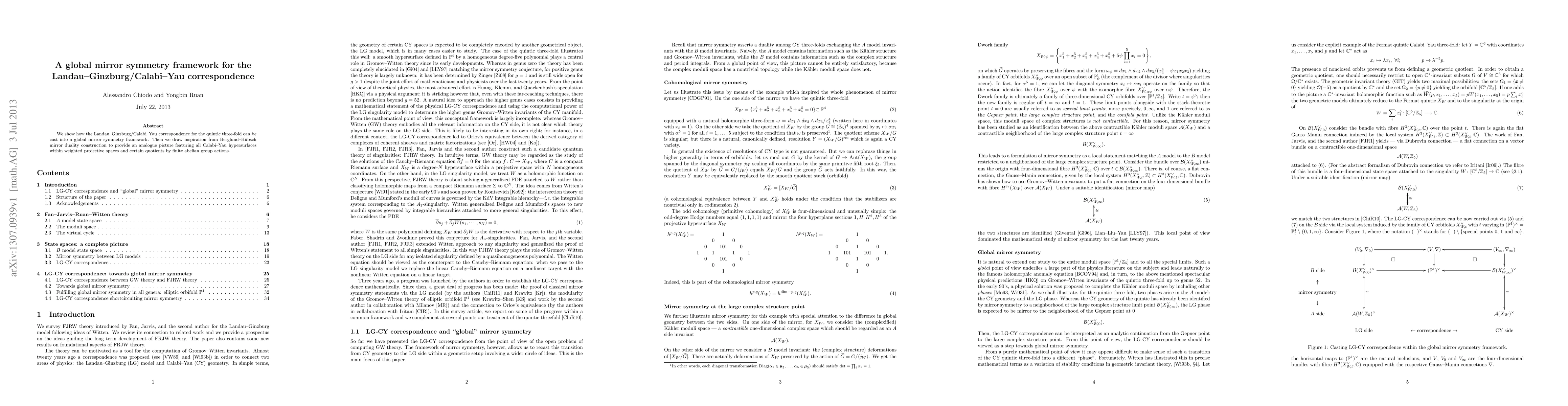 This paper establishes a global mirror symmetry framework for the Landau-Ginzburg/Calabi-Yau correspondence, specifically for the quintic three-fold, and extends this framework to cover all Calabi-Yau hypersurfaces in weighted projective spaces and certain quotients by finite abelian groups.