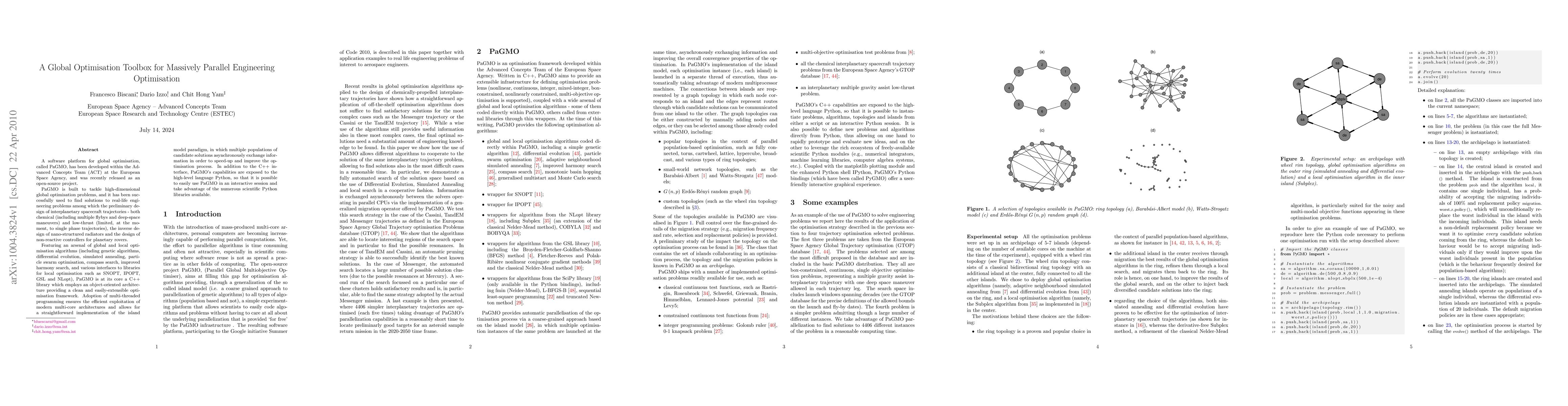PaGMO, an open-source global optimisation toolbox developed by the European Space Agency, offers a versatile C++ library with Python interfaces, featuring various algorithms for high-dimensional optimisation problems, and has been applied to engineering challenges such as spacecraft trajectory design and nano-structured radiator inverse design. It leverages multi-threaded programming and the island model paradigm for enhanced performance.