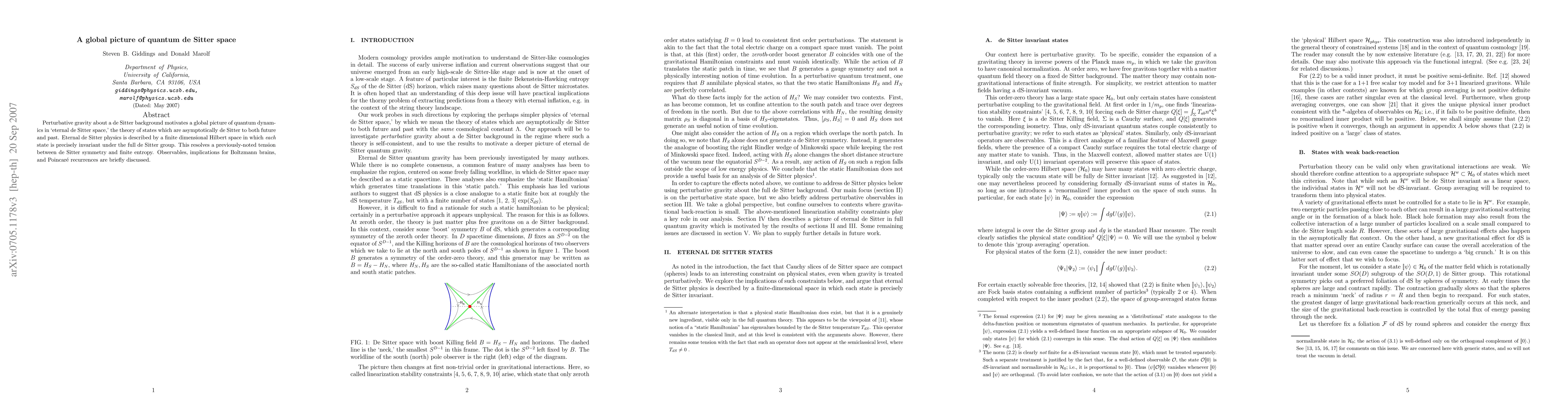 Perturbative gravity about a de Sitter background motivates a global picture of quantum dynamics in `eternal de Sitter space,' the theory of states which are asymptotically de Sitter to both future and past. Eternal de Sitter physics is described by a finite dimensional Hilbert space in which each state is precisely invariant under the full de Sitter group. This resolves a previously-noted tension between de Sitter symmetry and finite entropy. Observables, implications for Boltzmann brains, and Poincare recurrences are briefly discussed.