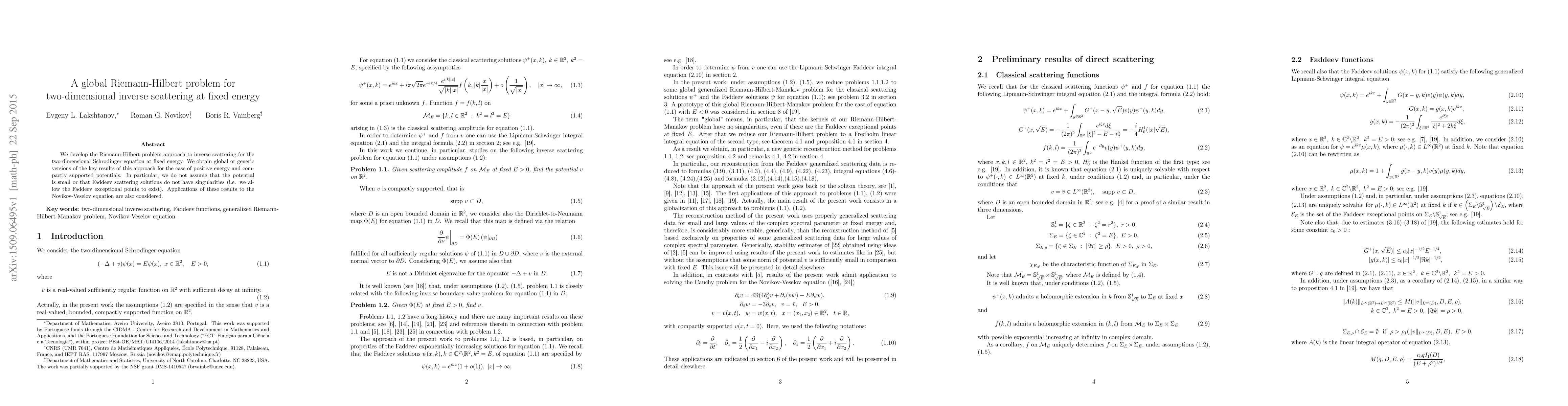 This paper develops a Riemann-Hilbert problem approach for inverse scattering of the two-dimensional Schrödinger equation at fixed energy, providing global results for positive energy and compactly supported potentials without smallness assumptions. Applications to the Novikov-Veselov equation are also explored.