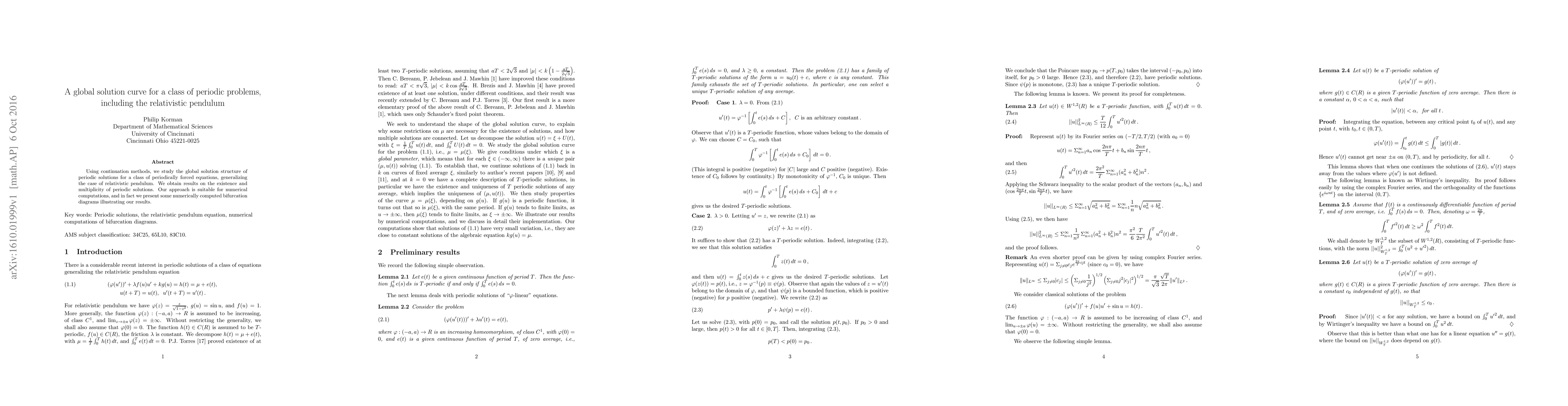 This paper employs continuation methods to explore the global solution structure of periodic solutions for a class of periodically forced equations, extending the analysis to the relativistic pendulum. It provides results on the existence and multiplicity of these solutions, supported by numerically computed bifurcation diagrams.