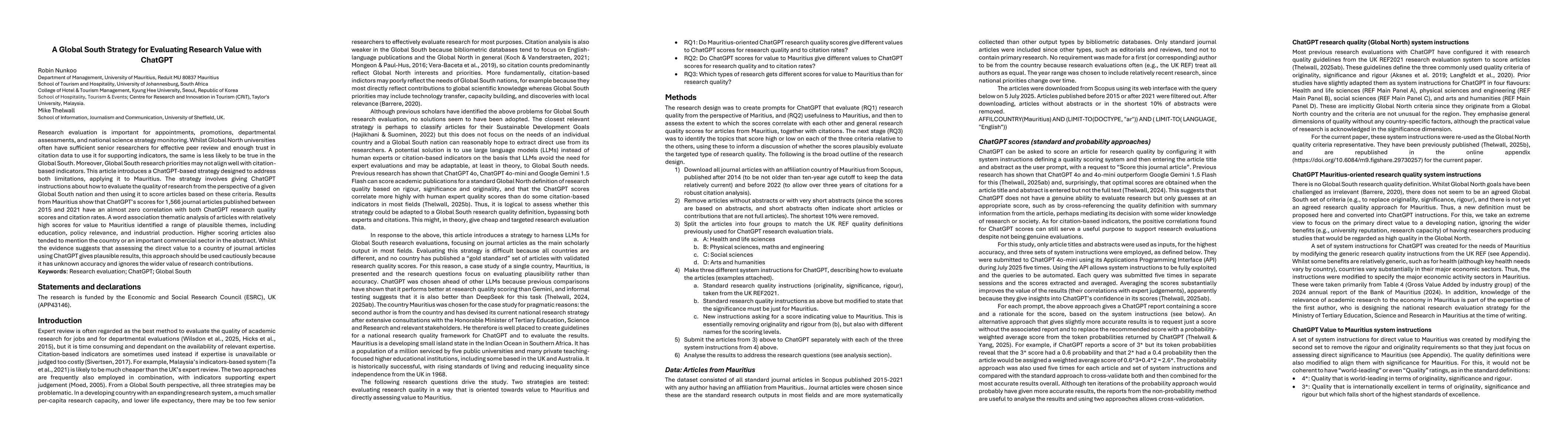 Research evaluation is important for appointments, promotions, departmental assessments, and national science strategy monitoring. Whilst Global North universities often have sufficient senior researchers for effective peer review and enough trust in citation data to use it for supporting indicators, the same is less likely to be true in the Global South. Moreover, Global South research priorities may not align well with citation-based indicators. This article introduces a ChatGPT-based strategy designed to address both limitations, applying it to Mauritius. The strategy involves giving ChatGPT instructions about how to evaluate the quality of research from the perspective of a given Global South nation and then using it to score articles based on these criteria. Results from Mauritius show that ChatGPT's scores for 1,566 journal articles published between 2015 and 2021 have an almost zero correlation with both ChatGPT research quality scores and citation rates. A word association thematic analysis of articles with relatively high scores for value to Mauritius identified a range of plausible themes, including education, policy relevance, and industrial production. Higher scoring articles also tended to mention the country or an important commercial sector in the abstract. Whilst the evidence suggests that assessing the direct value to a country of journal articles using ChatGPT gives plausible results, this approach should be used cautiously because it has unknown accuracy and ignores the wider value of research contributions.