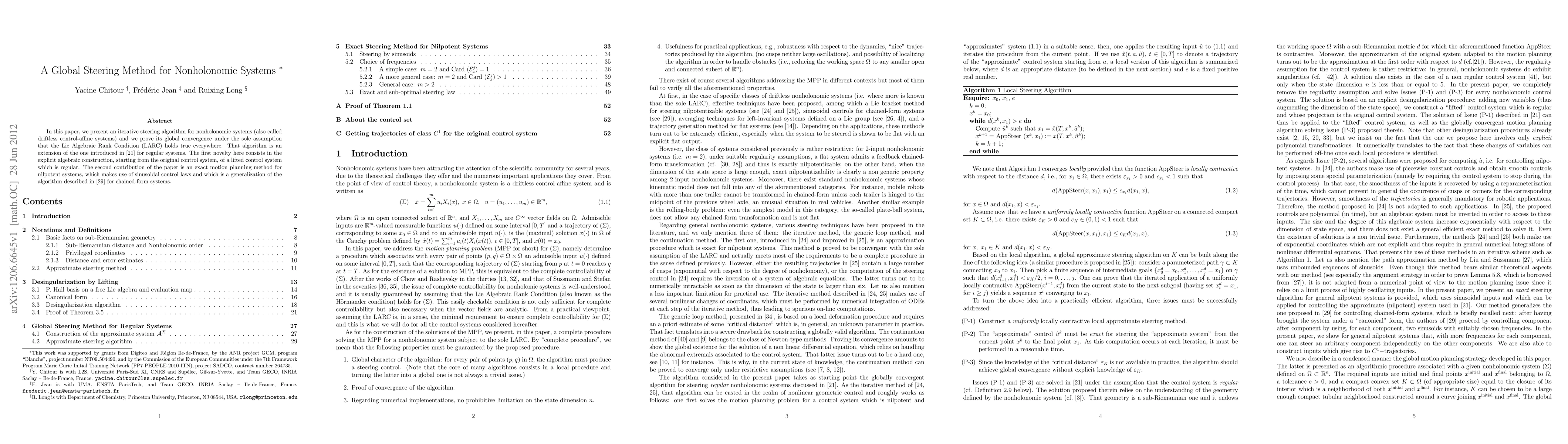 In this paper, we present an iterative steering algorithm for nonholonomic systems (also called driftless control-affine systems) and we prove its global convergence under the sole assumption that the Lie Algebraic Rank Condition (LARC) holds true everywhere. That algorithm is an extension of the one introduced in [21] for regular systems. The first novelty here consists in the explicit algebraic construction, starting from the original control system, of a lifted control system which is regular. The second contribution of the paper is an exact motion planning method for nilpotent systems, which makes use of sinusoidal control laws and which is a generalization of the algorithm described in [29] for chained-form systems.