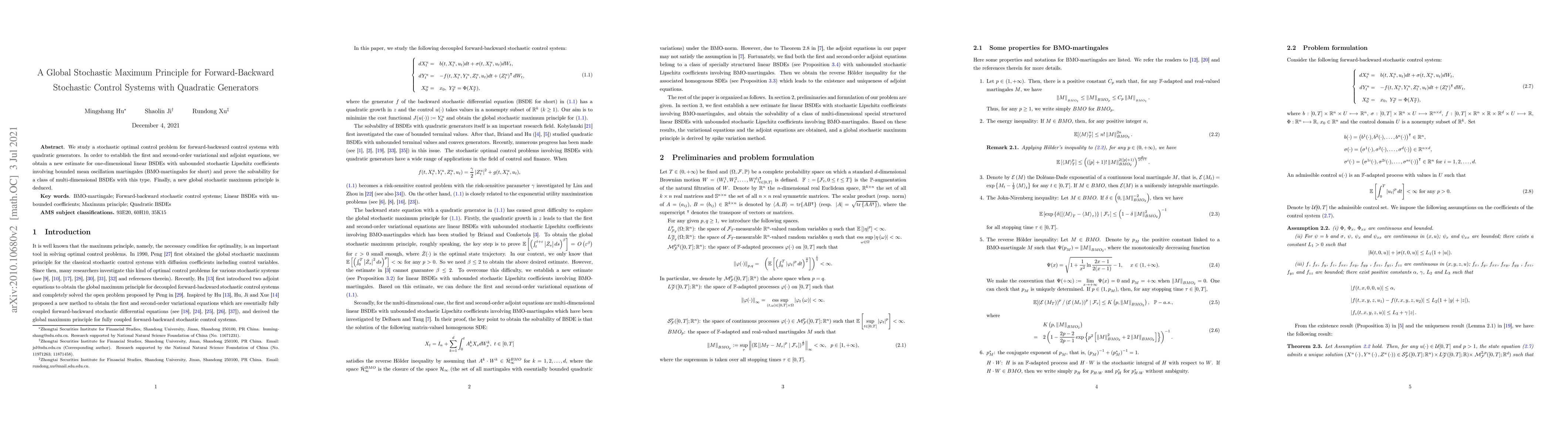 This paper develops a stochastic optimal control framework for forward-backward systems with quadratic generators, establishing new estimates for linear BSDEs and proving solvability for multi-dimensional BSDEs, ultimately deriving a novel global stochastic maximum principle.