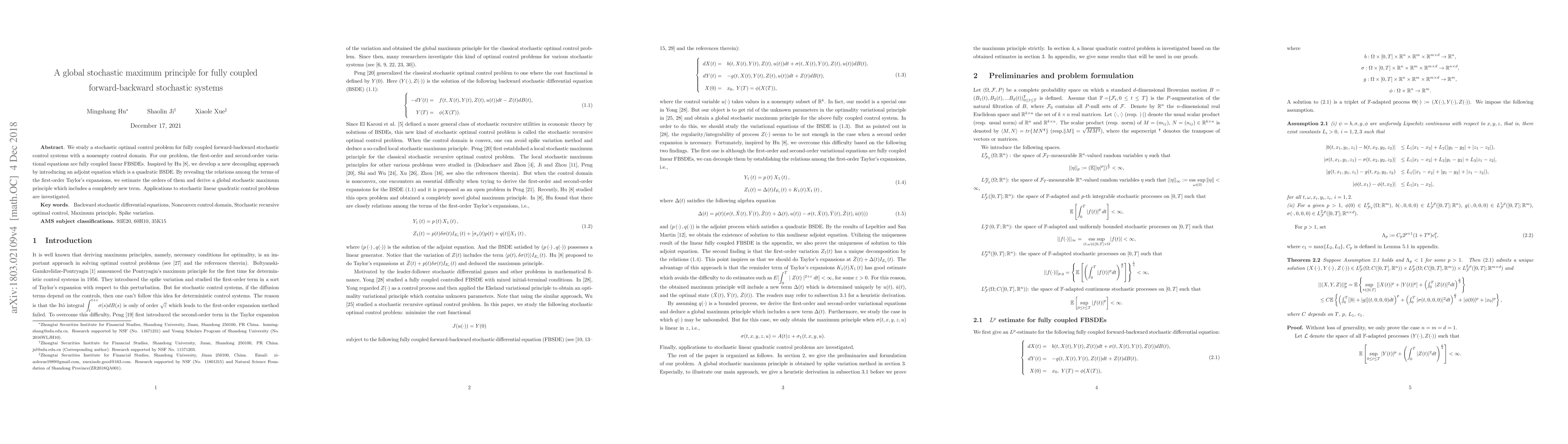 This paper develops a new decoupling approach for fully coupled forward-backward stochastic differential equations (FBSDEs) in stochastic optimal control problems. It introduces an adjoint equation, a quadratic BSDE, to derive a global stochastic maximum principle with a novel term, and applies the method to stochastic linear quadratic control problems.