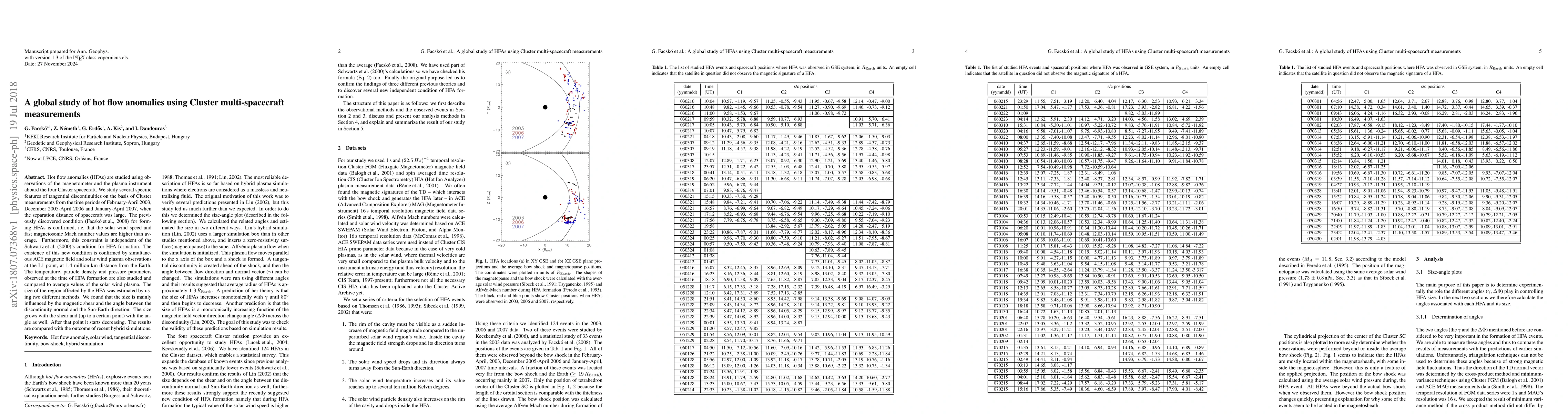 Hot flow anomalies (HFAs) are studied using observations of the magnetometer and the plasma instrument aboard the four Cluster spacecraft. We study several specific features of tangential discontinuities on the basis of Cluster measurements from the time periods of February-April 2003, December 2005-April 2006 and January-April 2007, when the separation distance of spacecraft was large. The previously discovered condition (Facsko et al., 2008) for forming HFAs is confirmed, i.e. that the solar wind speed and fast magnetosonic Mach number values are higher than average. Furthermore, this constraint is independent of the Schwartz et al. (2000)s condition for HFA formation. The existence of this new condition is confirmed by simultaneous ACE magnetic field and solar wind plasma observations at the L1 point, at 1.4 million km distance from the Earth. The temperature, particle density and pressure parameters observed at the time of HFA formation are also studied and compared to average values of the solar wind plasma. The size of the region affected by the HFA was estimated by using two different methods. We found that the size is mainly influenced by the magnetic shear and the angle between the discontinuity normal and the Sun-Earth direction. The size grows with the shear and (up to a certain point) with the angle as well. After that point it starts decreasing. The results are compared with the outcome of recent hybrid simulations.