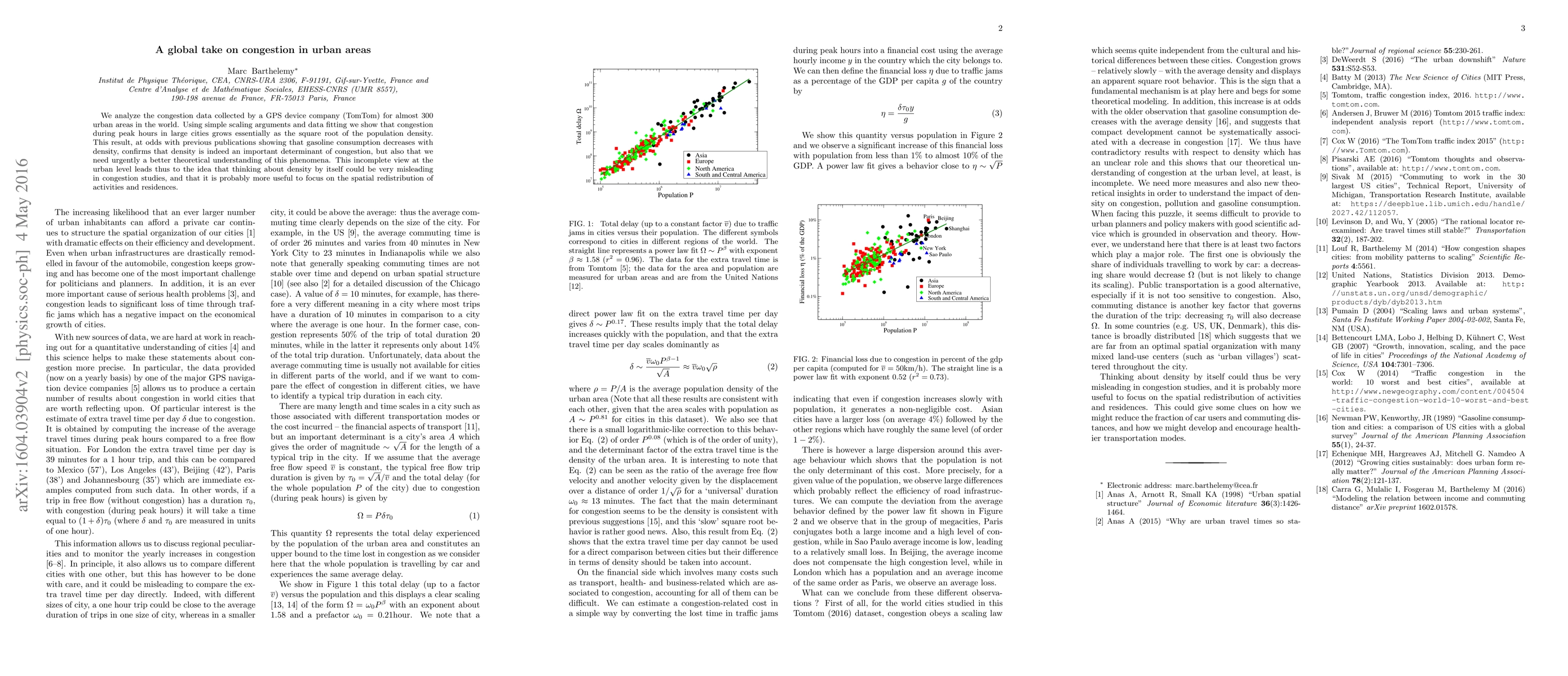 The study analyzes congestion data from TomTom in 300 urban areas, finding that peak-hour congestion scales with the square root of population density. This contrasts with previous findings on gasoline consumption and density, suggesting that density alone may not indicate congestion levels accurately, and emphasizing the need for a more nuanced understanding of urban activity distribution in congestion research.