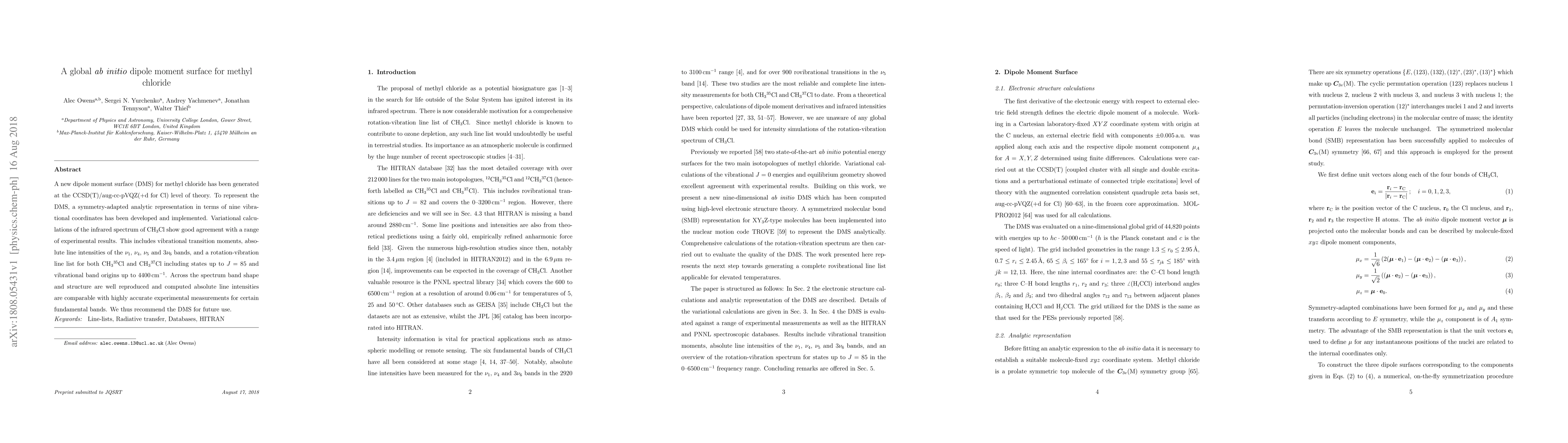 A new dipole moment surface (DMS) for methyl chloride has been generated at the CCSD(T)/aug-cc-pVQZ(+d for Cl) level of theory. To represent the DMS, a symmetry-adapted analytic representation in terms of nine vibrational coordinates has been developed and implemented. Variational calculations of the infrared spectrum of CH$_3$Cl show good agreement with a range of experimental results. This includes vibrational transition moments, absolute line intensities of the $\nu_1$, $\nu_4$, $\nu_5$ and $3\nu_6$ bands, and a rotation-vibration line list for both CH$_{3}{}^{35}$Cl and CH$_{3}{}^{37}$Cl including states up to $J=85$ and vibrational band origins up to $4400{\,}$cm$^{-1}$. Across the spectrum band shape and structure are well reproduced and computed absolute line intensities are comparable with highly accurate experimental measurements for certain fundamental bands. We thus recommend the DMS for future use.