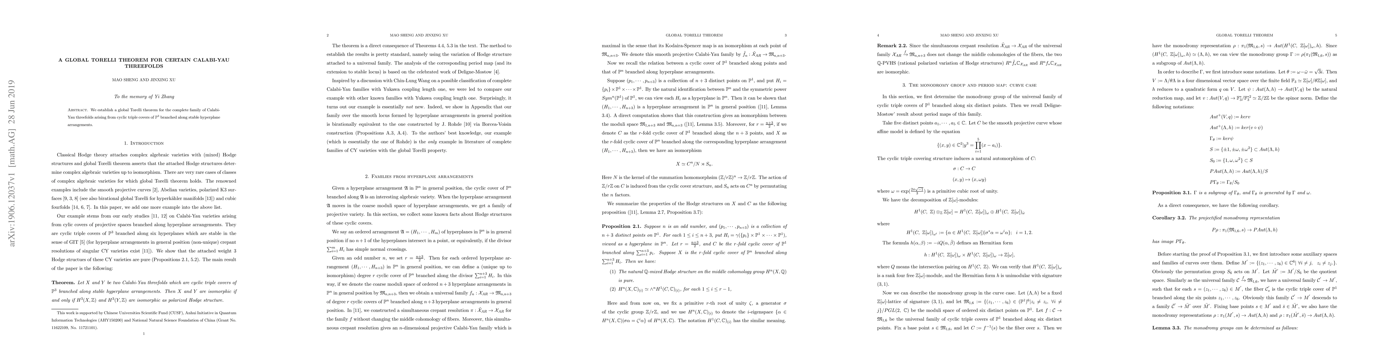 This paper proves a global Torelli theorem for a complete family of Calabi-Yau threefolds derived from cyclic triple covers of $\mathbb P^3$ using stable hyperplane arrangements, demonstrating their automorphic characterization by their period maps.