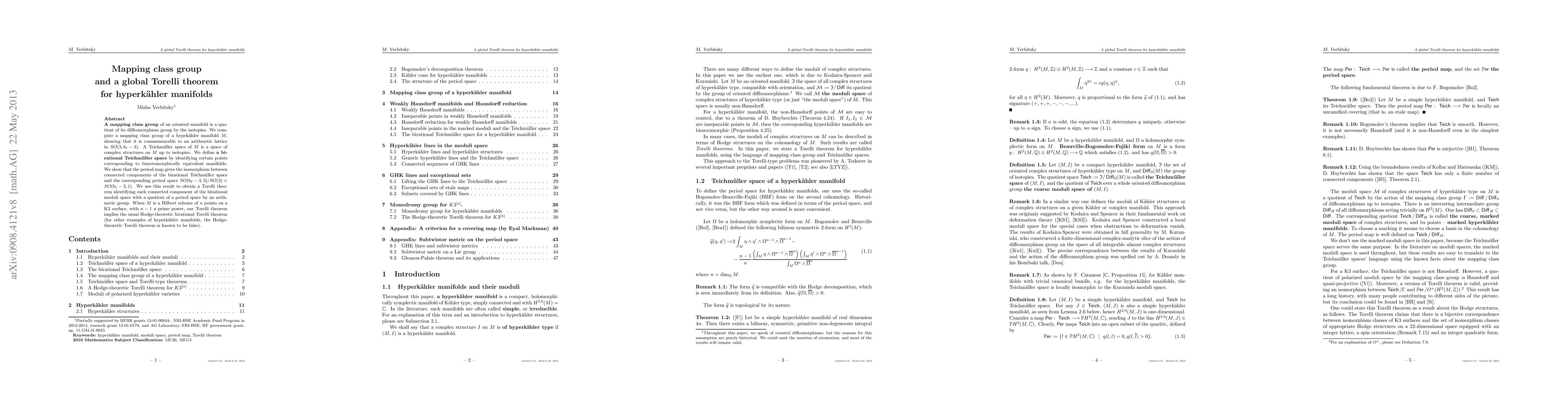 A mapping class group of an oriented manifold is a quotient of its diffeomorphism group by the isotopies. We compute a mapping class group of a hypekahler manifold $M$, showing that it is commensurable to an arithmetic subgroup in SO(3, b_2-3). A Teichmuller space of $M$ is a space of complex structures on $M$ up to isotopies. We define a birational Teichmuller space by identifying certain points corresponding to bimeromorphically equivalent manifolds, and show that the period map gives an isomorphism of the birational Teichmuller space and the corresponding period space $SO(b_2-3, 3)/SO(2)\times SO(b_2 -3, 1)$. We use this result to obtain a Torelli theorem identifying any connected component of birational moduli space with a quotient of a period space by an arithmetic subgroup. When $M$ is a Hilbert scheme of $n$ points on a K3 surface, with $n-1$ a prime power, our Torelli theorem implies the usual Hodge-theoretic birational Torelli theorem (for other examples of hyperkahler manifolds the Hodge-theoretic Torelli theorem is known to be false).