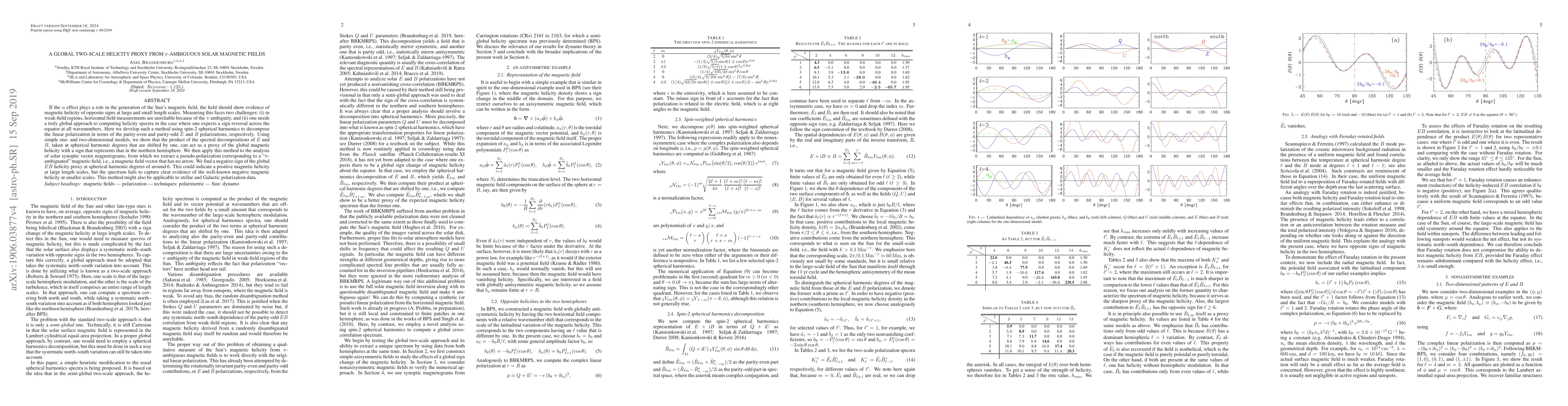 If the alpha effect plays a role in the generation of the Sun's magnetic field, the field should show evidence of magnetic helicity of opposite signs at large and small length scales. Measuring this faces two challenges: (i) in weak-field regions, horizontal field measurements are unreliable because of the pi ambiguity, and (ii) one needs a truly global approach to computing helicity spectra in the case where one expects a sign reversal across the equator at all wavenumbers. Here we develop such a method using spin-2 spherical harmonics to decompose the linear polarization in terms of the parity-even and parity-odd E and B polarizations, respectively. Using simple one- and two-dimensional models, we show that the product of the spectral decompositions of E and B, taken at spherical harmonic degrees that are shifted by one, can act as a proxy of the global magnetic helicity with a sign that represents that in the northern hemisphere. We then apply this method to the analysis of solar synoptic vector magnetograms, from which we extract a pseudo-polarization corresponding to a "pi-ambiguated" magnetic field, i.e., a magnetic field vector that has no arrow. We find a negative sign of the global EB helicity proxy at spherical harmonic degrees of around 6. This could indicate a positive magnetic helicity at large length scales, but the spectrum fails to capture clear evidence of the well-known negative magnetic helicity at smaller scales. This method might also be applicable to stellar and Galactic polarization data.