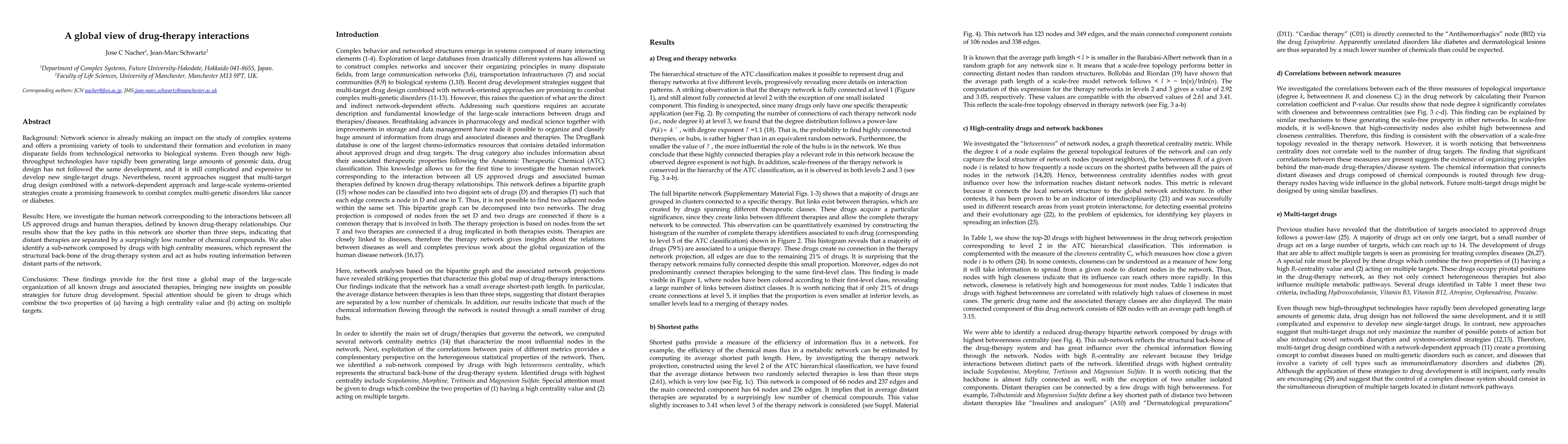Network science is already making an impact on the study of complex systems and offers a promising variety of tools to understand their formation and evolution (1-4) in many disparate fields from large communication networks (5,6), transportation infrastructures (7) and social communities (8,9) to biological systems (1,10,11). Even though new highthroughput technologies have rapidly been generating large amounts of genomic data, drug design has not followed the same development, and it is still complicated and expensive to develop new single-target drugs. Nevertheless, recent approaches suggest that multi-target drug design combined with a network-dependent approach and large-scale systems-oriented strategies (12-14) create a promising framework to combat complex multigenetic disorders like cancer or diabetes. Here, we investigate the human network corresponding to the interactions between all US approved drugs and human therapies, defined by known drug-therapy relationships. Our results show that the key paths in this network are shorter than three steps, indicating that distant therapies are separated by a surprisingly low number of chemical compounds. We also identify a sub-network composed by drugs with high centrality measures (15), which represent the structural back-bone of the drug-therapy system and act as hubs routing information between distant parts of the network. These findings provide for the first time a global map of the largescale organization of all known drugs and associated therapies, bringing new insights on possible strategies for future drug development. Special attention should be given to drugs which combine the two properties of (a) having a high centrality value and (b) acting on multiple targets.