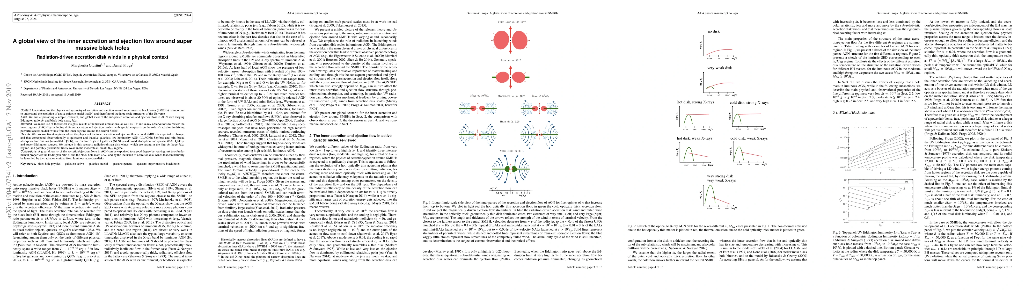 Understanding the physics and geometry of accretion and ejection around super massive black holes (SMBHs) is important to understand the evolution of active galactic nuclei (AGN) and therefore of the large scale structures of the Universe. We aim at providing a simple, coherent, and global view of the sub-parsec accretion and ejection flow in AGN with varying Eddington ratio, $\dot{m}$, and black hole mass, $M_{BH}$. We made use of theoretical insights, results of numerical simulations, as well as UV and X-ray observations to review the inner regions of AGN by including different accretion and ejection modes, with special emphasis on the role of radiation in driving powerful accretion disk winds from the inner regions around the central SMBH. We propose five $\dot{m}$ regimes where the physics of the inner accretion and ejection flow around SMBHs is expected to change, and that correspond observationally to quiescent and inactive galaxies; low luminosity AGN (LLAGN); Seyferts and mini-broad absorption line quasars (mini-BAL QSOs); narrow line Seyfert 1 galaxies (NLS1s) and broad absorption line quasars (BAL QSOs); and super-Eddington sources. We include in this scenario radiation-driven disk winds, which are strong in the high $\dot{m}$, large $M_{BH}$ regime, and possibly present but likely weak in the moderate $\dot{m}$, small $M_{BH}$ regime. A great diversity of the accretion/ejection flows in AGN can be explained to a good degree by varying just two fundamental properties: the Eddington ratio $\dot{m}$ and the black hole mass $M_{BH}$, and by the inclusion of accretion disk winds that can naturally be launched by the radiation emitted from luminous accretion disks.