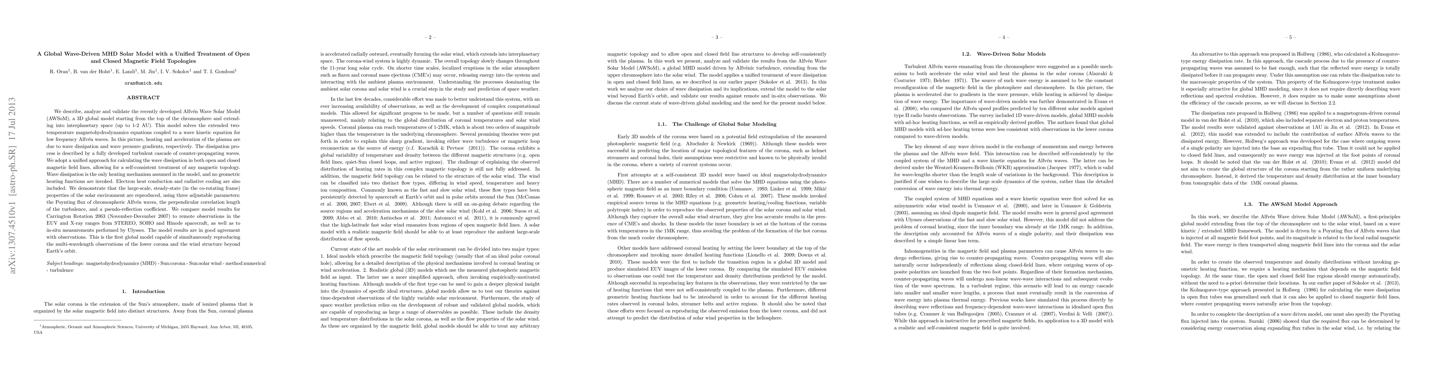 This paper presents the Alfv\'en Wave Solar Model (AWSoM), a 3D global model that simulates the solar environment from the chromosphere to interplanetary space, focusing on wave-driven heating and acceleration through Alfv\'en wave dissipation. The model successfully reproduces large-scale solar properties and agrees with observational data from multiple spacecraft.