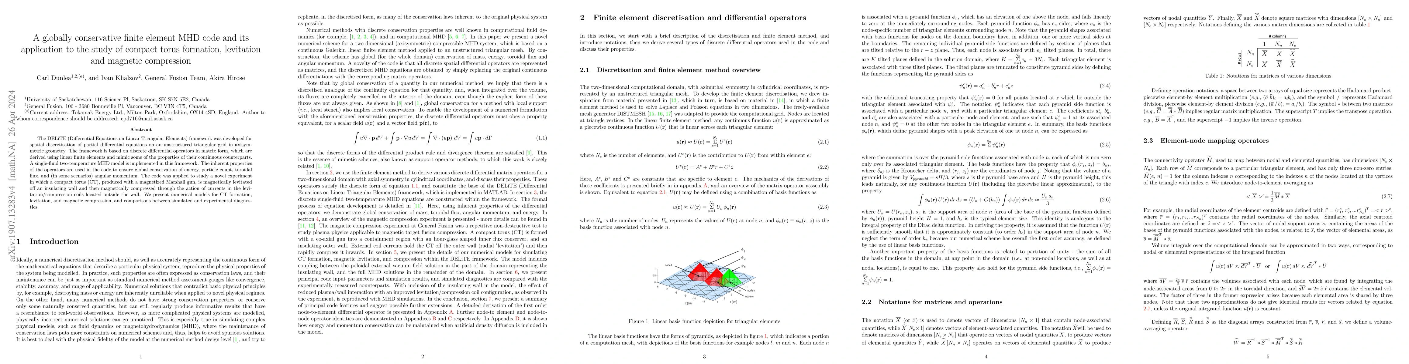 The DELiTE (Differential Equations on Linear Triangular Elements) framework was developed for spatial discretisation of partial differential equations on an unstructured triangular grid in axisymmetric geometry. The framework is based on discrete differential operators in matrix form, which are derived using linear finite elements and mimic some of the properties of their continuous counterparts. A single-fluid two-temperature MHD code is implemented in this framework. The inherent properties of the operators are used in the code to ensure global conservation of energy, particle count, toroidal flux, and angular momentum. The code was applied to study a novel experiment in which a compact torus (CT), produced with a magnetized Marshall gun, is magnetically levitated off an insulating wall and then magnetically compressed through the action of currents in the levitation/compression coils located outside the wall. We present numerical models for CT formation, levitation, and magnetic compression, and comparisons between simulated and experimental diagnostics.