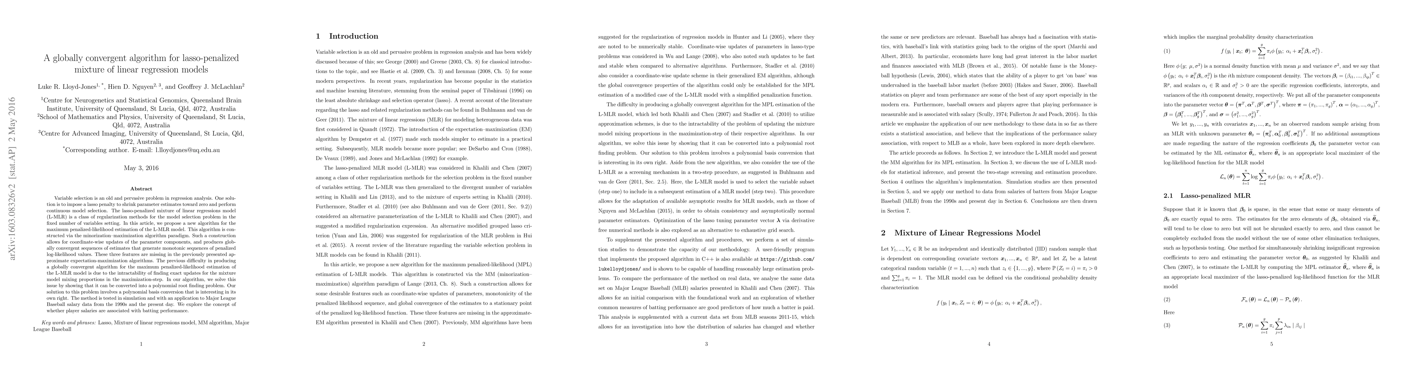 This paper proposes a globally convergent algorithm for estimating the lasso-penalized mixture of linear regression models (L-MLR), addressing the challenge of finding exact updates for mixture model mixing proportions. The algorithm, based on the minorization-maximization paradigm, is tested on Major League Baseball salary data to investigate the relationship between player salaries and batting performance.
